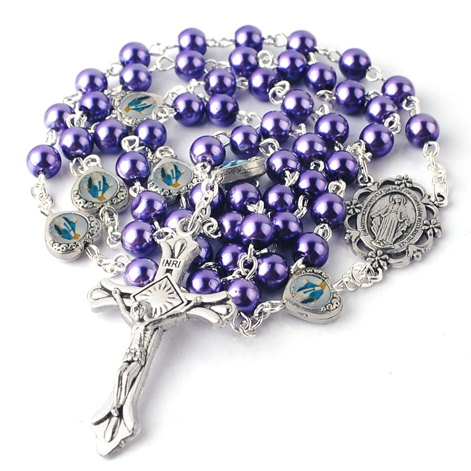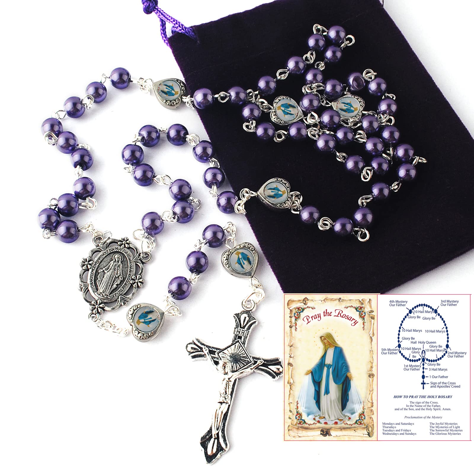 - Original Y-Necklaces – Glass Pearl Beads with Miraculous Epoxy Heart Metal Beads Rosary Necklace pack in Velvet Gift Bag with Rosary Pray Card (Purple) by HanlinCC