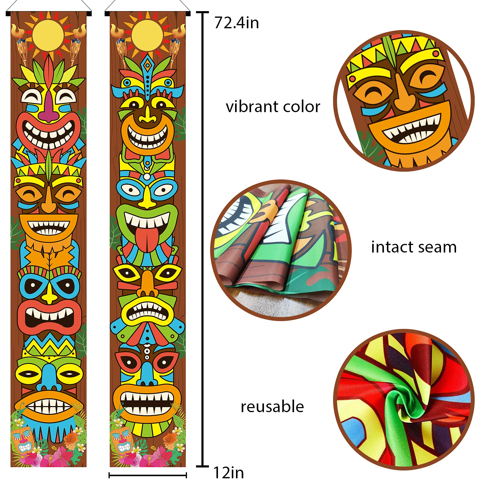 - Value Pack:2 pack tiki party porch sign, approx. 12 x 72.4. Designed with hibiscus flowers, tiki masks , aloha torch, sun, plam leaves.