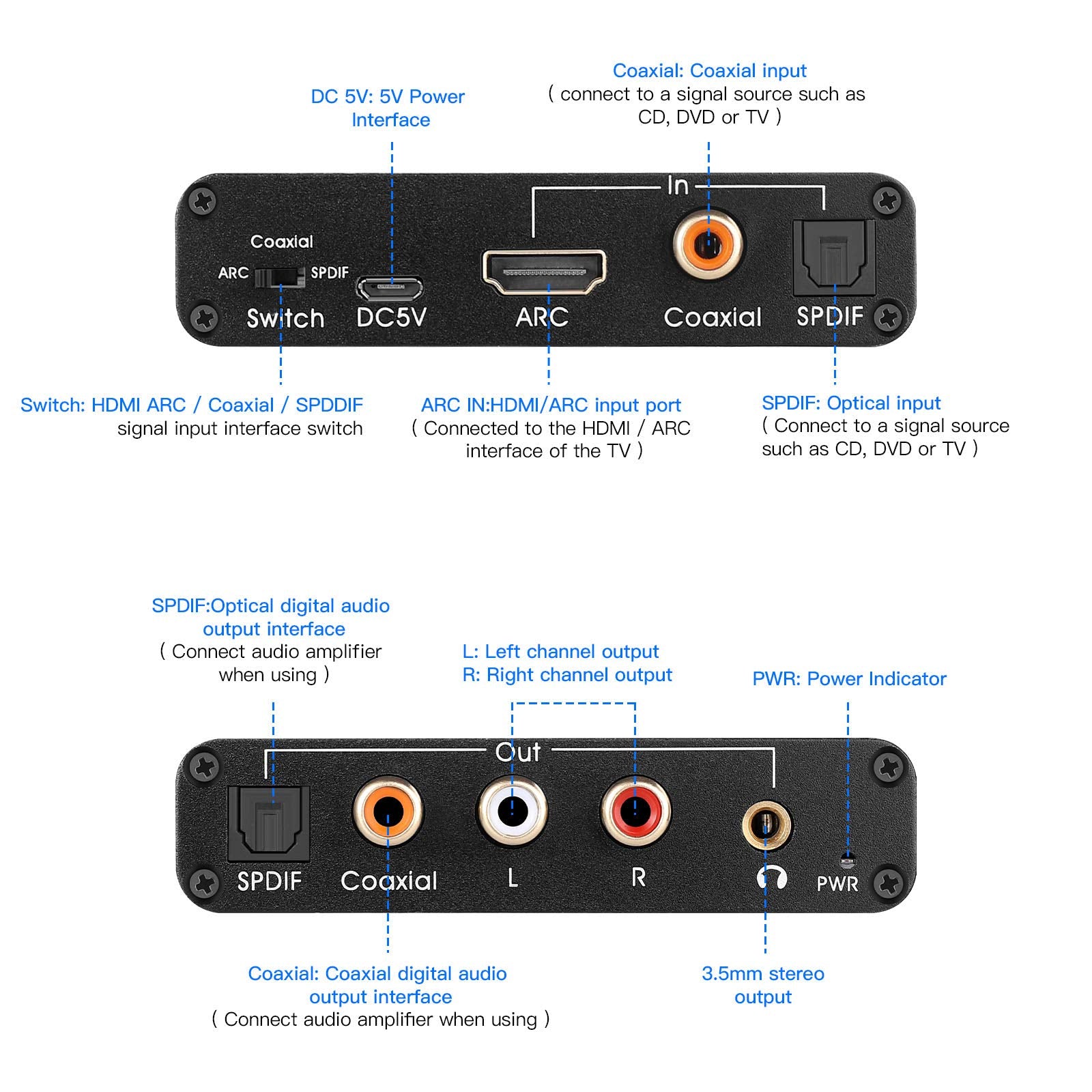 - Original Digital to Analog Converters – HDMI ARC Audio Extractor 192KHz DAC Converter ARC Audio Extractor Support Digital HDMI Audio to Analog Stereo Audio RCA L/R Coaxial SPDIF and 3.5mm Jack ARC Audio Adapter for TV by RGBTEK