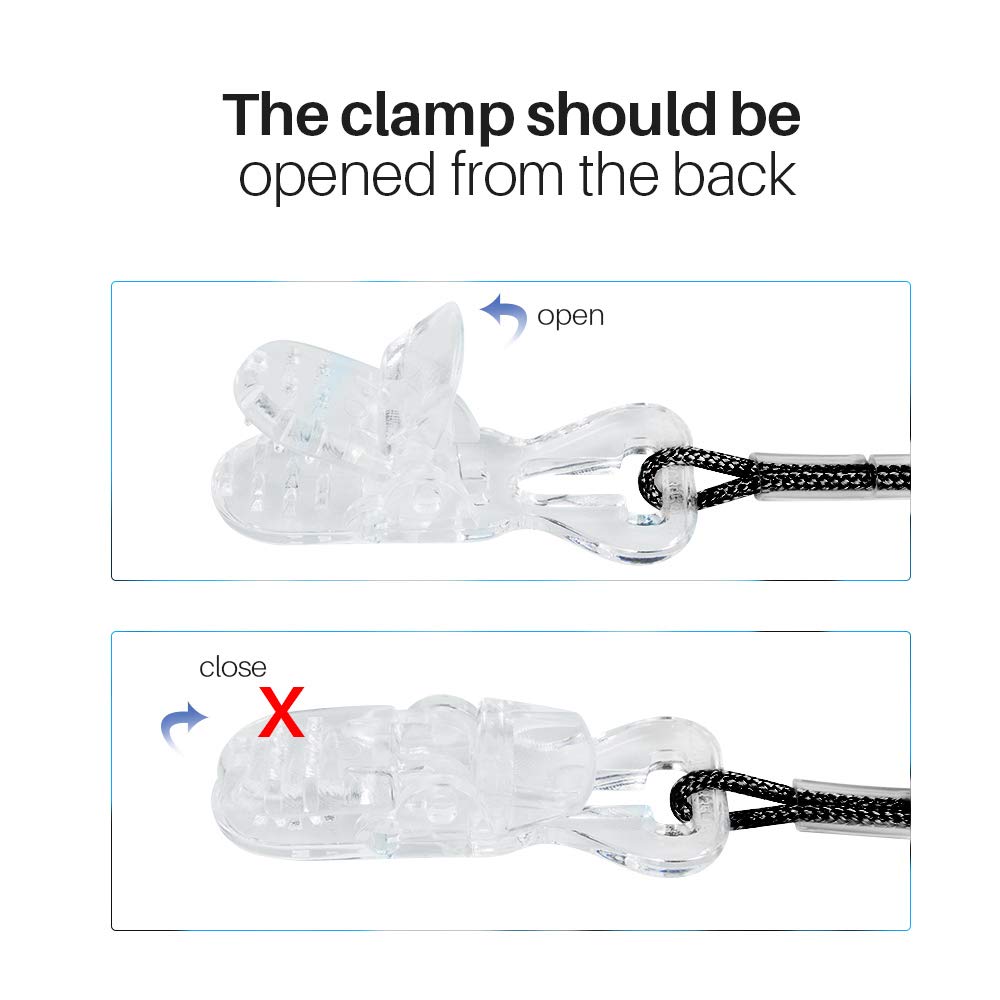 2. Before you use please notice the picture. As it shows, the clamp should be opened from the back instead of the front. Otherwise the clamp will break.