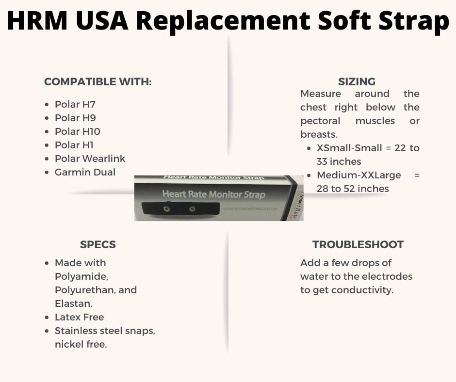 - Original – Heart Rate Monitor USA Replacement Soft Transmitter Strap (works with Polar H1, H7, H9, H10 and Polar Wearlink Models & Garmin Dual) Size Med/XXL by hrm