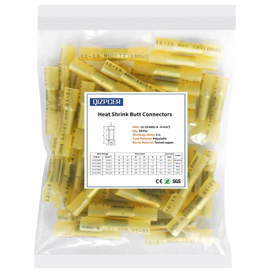 - Original Butt – Heat Shrink Butt Connectors, 12-10 AWG 50 Pcs Yellow Waterproof Crimp Terminals Electrical Wire Connectors Splice for Marine, Cable, Wiring by Qizpcer