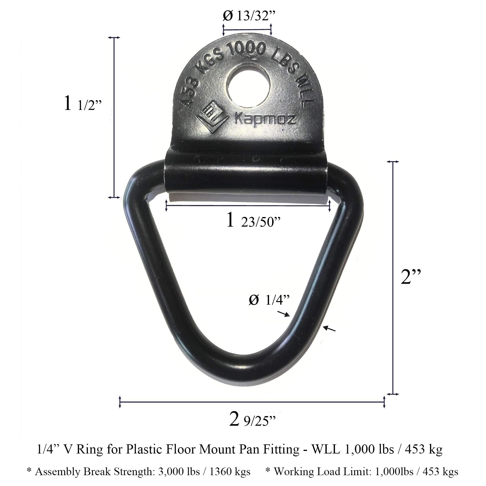 - STRONG & DURABLE: These bolt-on V-rings are made of high-strength steel. Ultimate Assembly Breaking Strength: 3,000 pounds; Awesome Safe Working Load: 1,000 pounds per pack. That means that these 4 rings can bear up to 4,000 pounds together! Direct replacement for D-Ring Plastic Flush Mount Pan Fitting Tie down