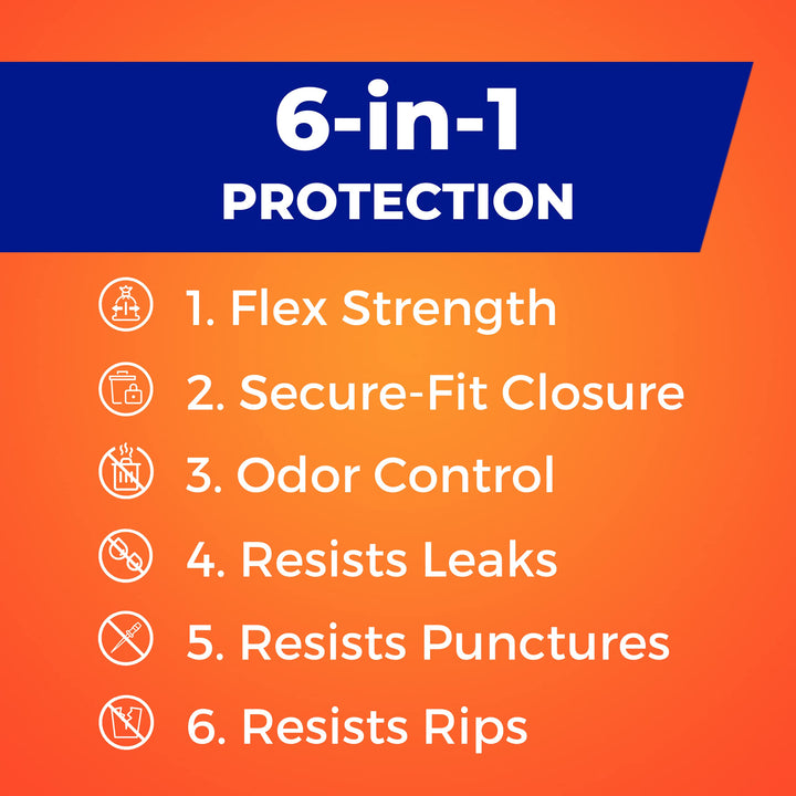 - TRIPLE-ACTION TECHNOLOGY—These kitchen garbage bags stretch and expand to accommodate oversized loads without punctures, leaks or tears