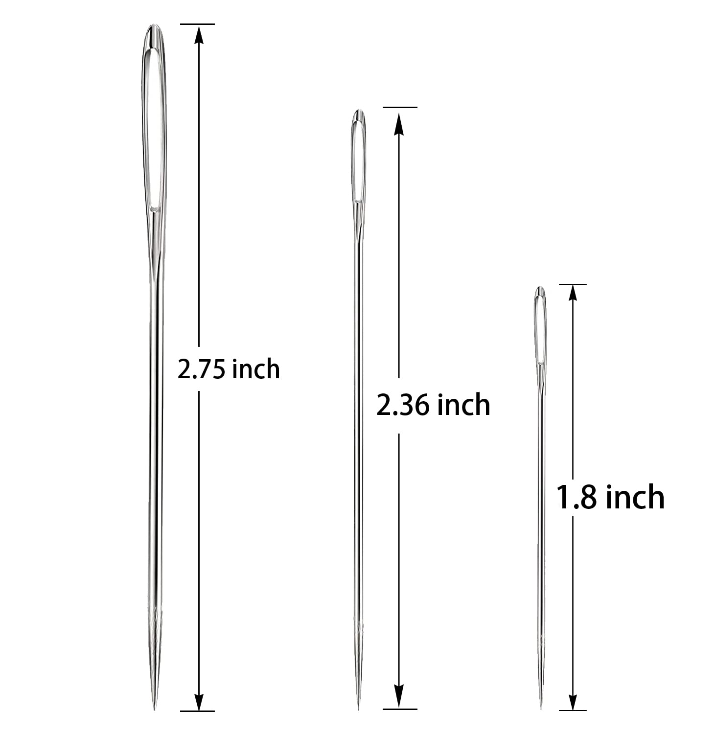 --The large eye needles size: 7pcs 1.05 x 46 mm/1.8 inch, 7pcs 1.25x 60 mm/ 2.4 inch, 7pcs 2 x 70 mm/ 2.8 inch.