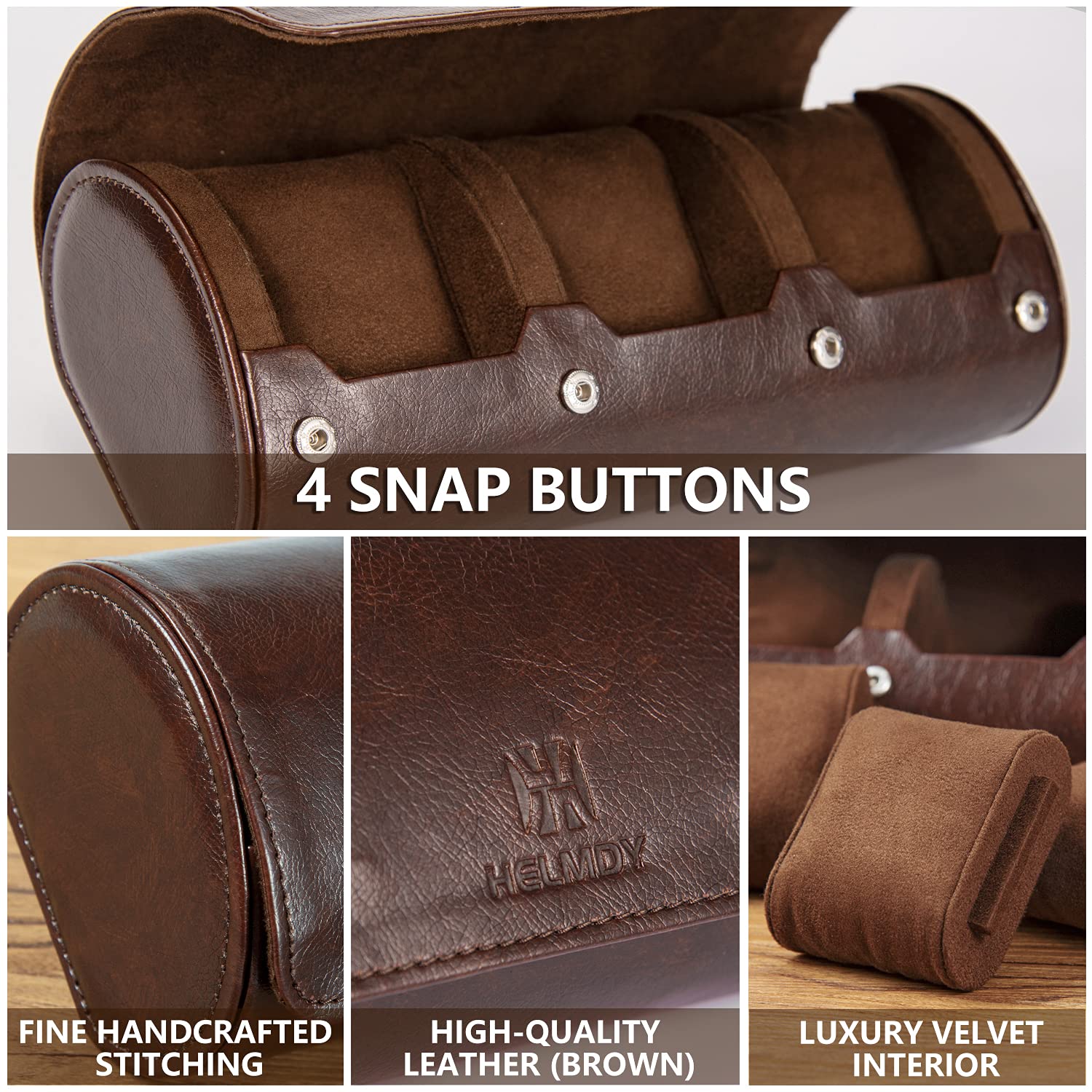 - Other Attractive Features: HELMDY watch box is handcrafted from deep brown pu leather which is nature and fashion, fine accent stitching finish, soft touch of velvet interior, sturdy construction and 4 hidden snaps closure gives you peace of mind when you take this watch box organizer traveling