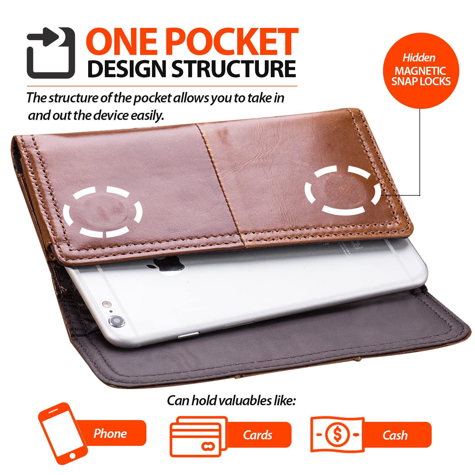 - Pocket: Spacious compartment for your phone with a room to spare for cards or bills.The smooth inner makes reaching and pulling out the smartphone a lot quicker and easier. It is fully secured with the flap cover to keep your phone from falling