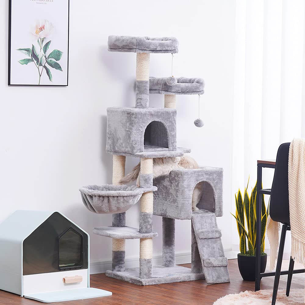 - Original Trees – 58'' Multi-Level Cat Tree Condo Furniture with Sisal-Covered Scratching Posts, 2 Plush Condos, Hammock for Kittens, Cats and Pets Light Gray MPJ013W by Hey-brother
