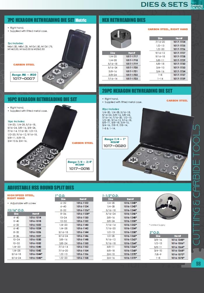 - Includes one of each tap & die 1/4-18, 3/8-18 and 1/2-14