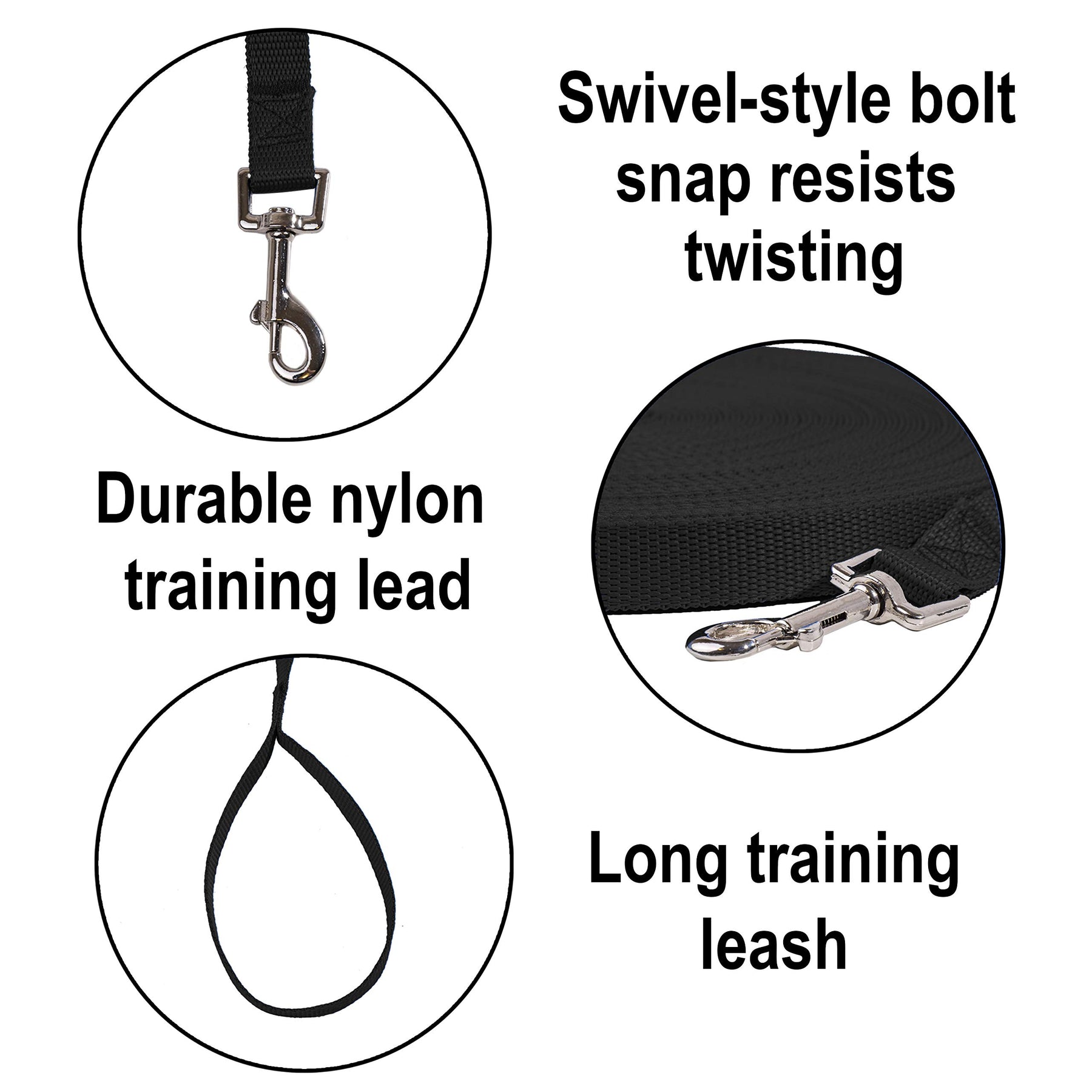 - Nylon Training Lead - This durable, long, nylon dog training leash will outlast cotton leashes. All stitching is reinforced and the nickel plated clip swivels to resist twisting. Our long dog leash is great for medium and large dogs. You'll love using it as a backyard dog leash, for off leash dog training, and more.