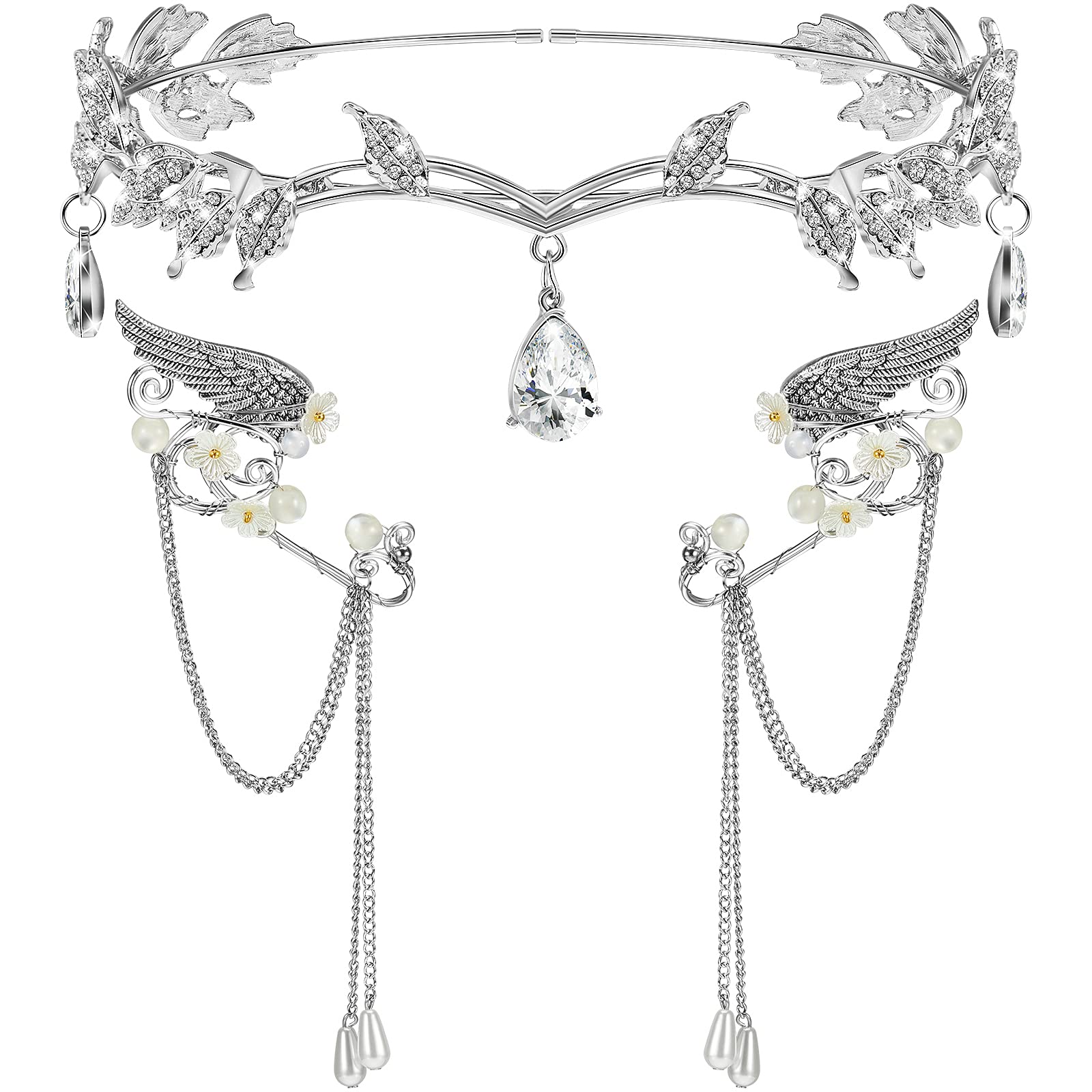- Beautiful and cute design: the rhinestone leaf headband is silver in color, and the theme design is a crown of leaves with rhinestones embedded in the middle, which looks very noble and dazzling; The elf ear cuffs earrings are made of leaves, equipped with a few small pearl flowers, which look very nice