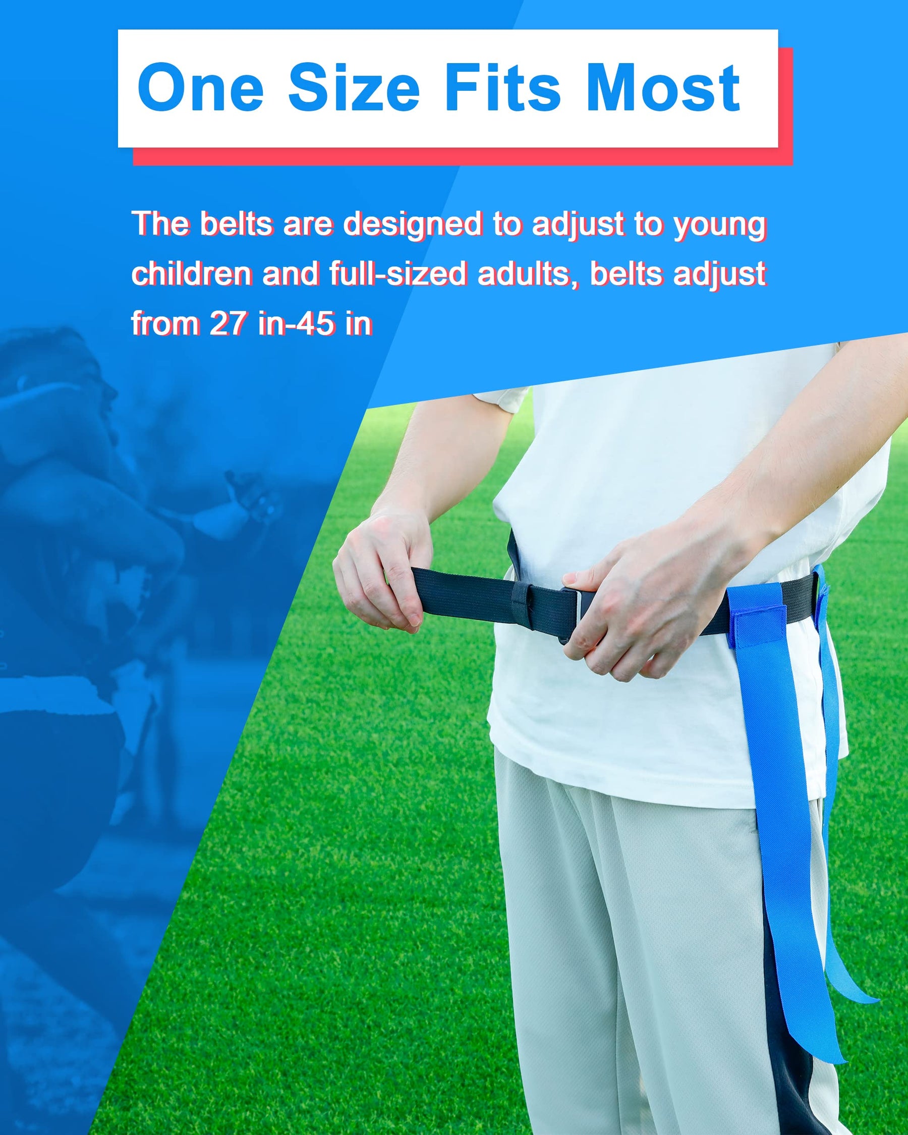 - Adjustable flag football belts, 45 inches long, and is suitable for players of almost all ages. A large 2 inches strong release buckle replaces two rings to secure the belt and allows for easier on and off, and easy to adjust