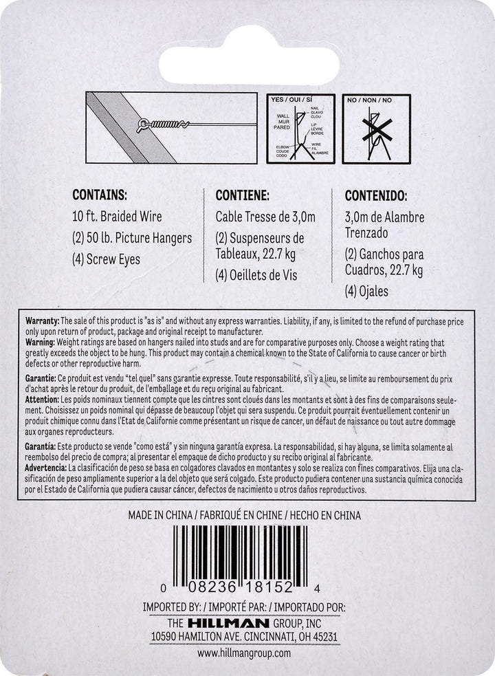 - Includes 10 Foot braided wire, hook with nail and screw eyes