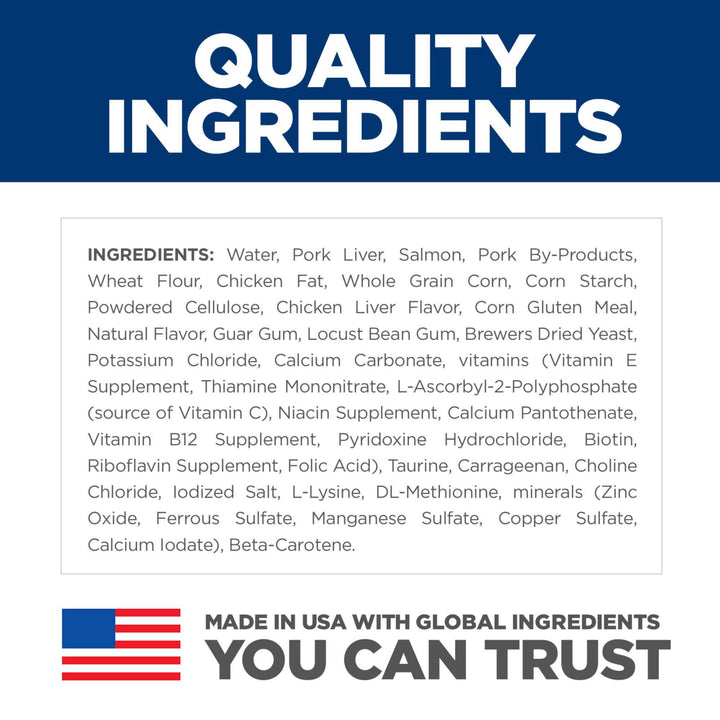 | ingredients | Water, Pork By-Products, Salmon, Pork Liver, Wheat Flour, Chicken Fat, Corn Starch, Whole Grain Corn, Powdered Cellulose, Chicken Liver Flavor, Rice, Natural Flavor, Corn Gluten Meal, Locust Bean Gum, L-Lysine, Guar Gum, Brewers Dried Yeast, Calcium Carbonate, Potassium Chloride, Carrageenan, Choline Chloride, DL-Methionine, Potassium Citrate, Taurine, vitamins (Vitamin E Supplement, Thiamine Mononitrate, Niacin Supplement, Pyridoxine Hydrochloride, Calcium Pantothenate, Vitamin B12 Supplement, Riboflavin Supplement, Biotin, Folic Acid), Iodized Salt, minerals (Zinc Oxide, Ferrous Sulfate, Manganese Sulfate, Copper Sulfate, Calcium Iodate), Iron Oxide color. |