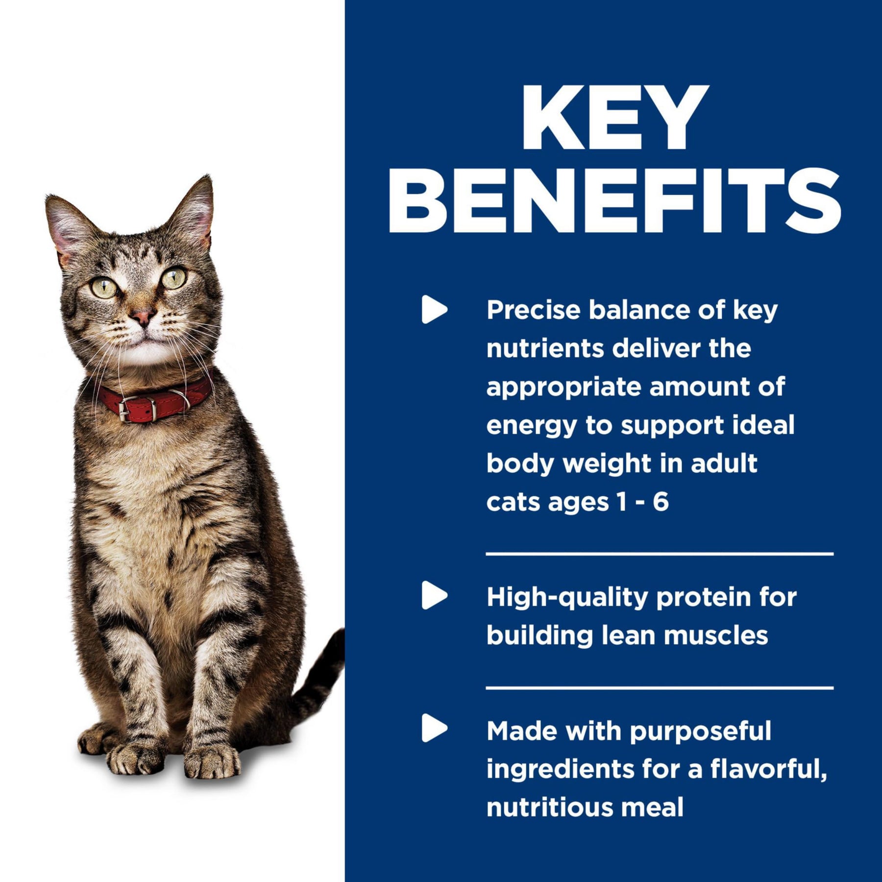 - Precise balance of key nutrients deliver the appropriate amount of energy to support ideal body weight in adult cats