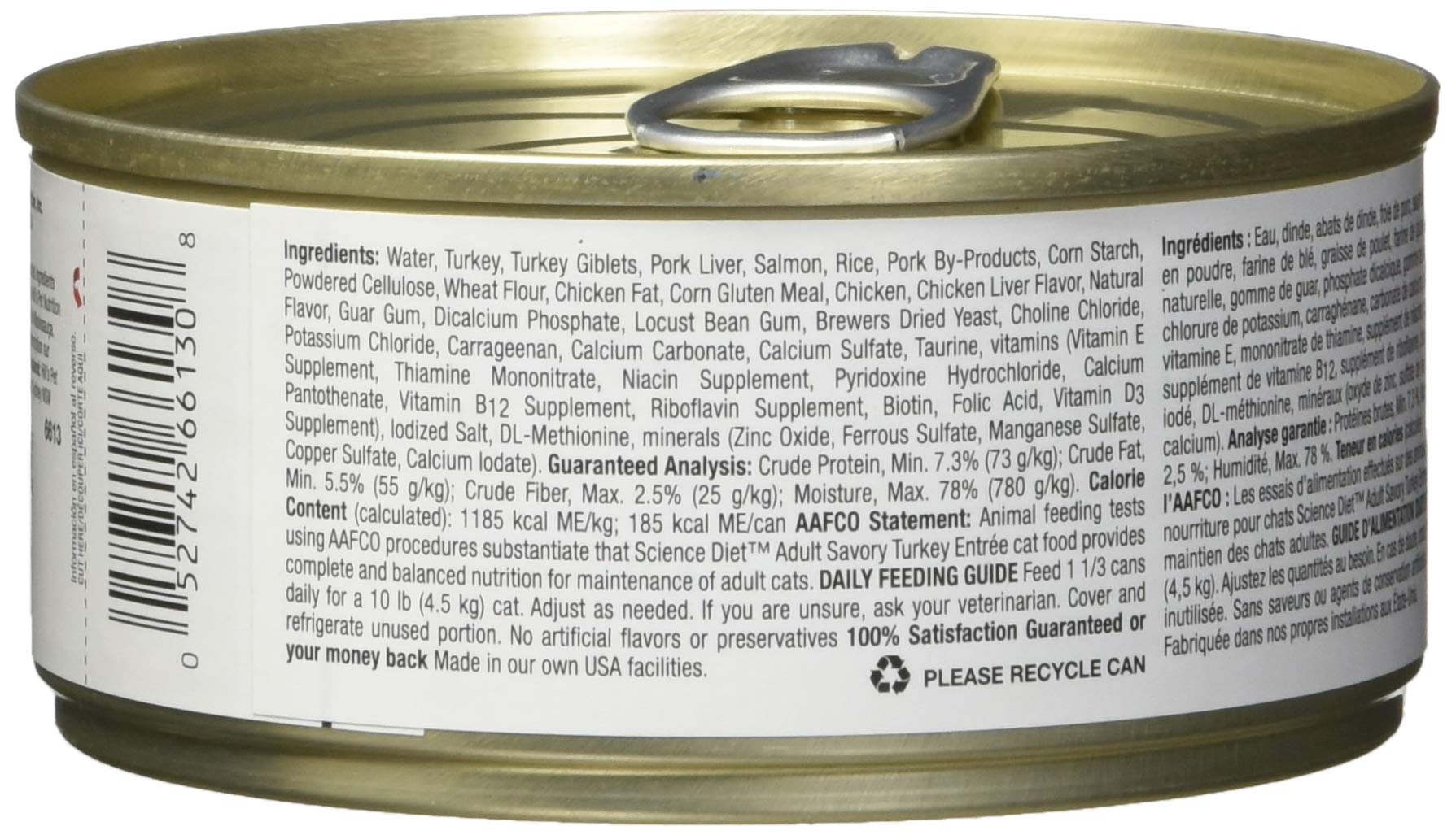 | ingredients | Water, Turkey, Turkey Giblets, Pork Liver, Salmon, Rice, Pork By-Products, Corn Starch, Powdered Cellulose, Wheat Flour, Chicken Fat, Corn Gluten Meal, Chicken, Chicken Liver Flavor, Natural Flavor, Guar Gum, Dicalcium Phosphate, Locust Bean Gum, Brewers Dried Yeast, Choline Chloride, Potassium Chloride, Carrageenan, Calcium Carbonate, Calcium Sulfate, Taurine, vitamins (Vitamin E Supplement, Thiamine Mononitrate, Niacin Supplement, Pyridoxine Hydrochloride, Calcium Pantothenate, Vitamin B12 Supplement, Riboflavin Supplement, Biotin, Folic Acid, Vitamin D3 Supplement), Iodized Salt, DL-Methionine, minerals (Zinc Oxide, Ferrous Sulfate, Manganese Sulfate, Copper Sulfate, Calcium Iodate). |
