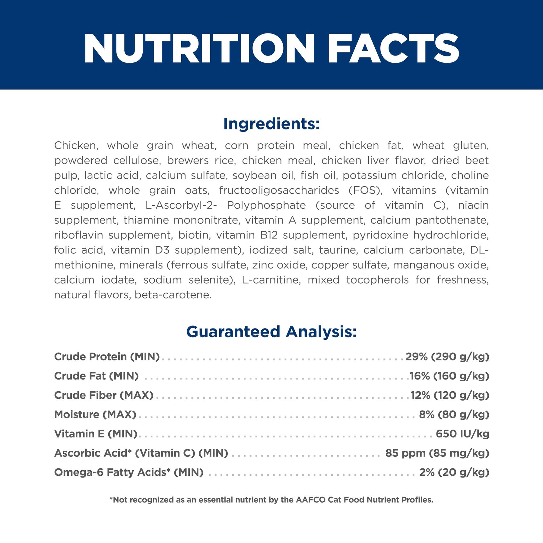 | ingredients | Chicken, Whole Grain Wheat, Corn Gluten Meal, Chicken Fat, Powdered Cellulose, Wheat Gluten, Chicken Liver Flavor, Dried Beet Pulp, Brewers Rice, Lactic Acid, Potassium Chloride, Fish Oil, Calcium Sulfate, Choline Chloride, Calcium Carbonate, Dicalcium Phosphate, Taurine, vitamins (Vitamin E Supplement, L-Ascorbyl-2-Polyphosphate (source of Vitamin C), Niacin Supplement, Thiamine Mononitrate, Vitamin A Supplement, Calcium Pantothenate, Riboflavin Supplement, Biotin, Vitamin B12 Supplement, Pyridoxine Hydrochloride, Folic Acid, Vitamin D3 Supplement), minerals (Ferrous Sulfate, Zinc Oxide, Copper Sulfate, Manganous Oxide, Calcium Iodate, Sodium Selenite), Iodized Salt, L-Carnitine, Mixed Tocopherols for freshness, Green Peas, Natural Flavors, Apples, Cranberries, Carrots, Broccoli, Beta-Carotene. |