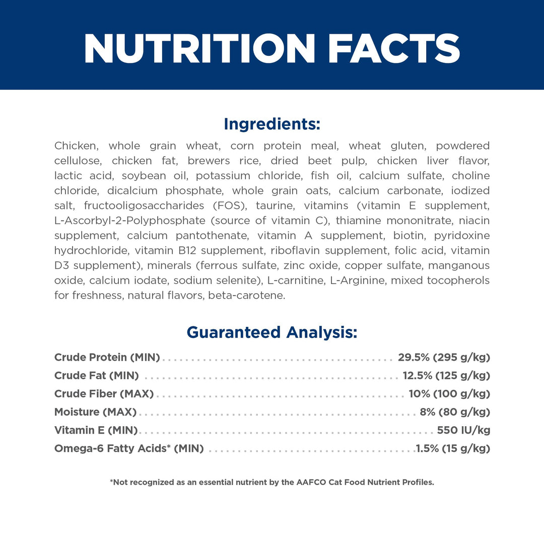 | ingredients | Chicken, Whole Grain Wheat, Corn Gluten Meal, Chicken Fat, Powdered Cellulose, Wheat Gluten, Brewers Rice, Dried Beet Pulp, Pork Flavor, Calcium Sulfate, Lactic Acid, Potassium Chloride, Soybean Oil, Fish Oil, Dicalcium Phosphate, Choline Chloride, Taurine, vitamins (Vitamin E Supplement, L-Ascorbyl-2-Polyphosphate (source of Vitamin C), Niacin Supplement, Thiamine Mononitrate, Vitamin A Supplement, Calcium Pantothenate, Riboflavin Supplement, Biotin, Vitamin B12 Supplement, Pyridoxine Hydrochloride, Folic Acid, Vitamin D3 Supplement), Calcium Carbonate, Iodized Salt, minerals (Ferrous Sulfate, Zinc Oxide, Copper Sulfate, Manganous Oxide, Calcium Iodate, Sodium Selenite), L-Carnitine, Oat Fiber, Mixed Tocopherols for freshness, Natural Flavors, Beta-Carotene, Apples, Broccoli, Carrots, Cranberries, Green Peas. |