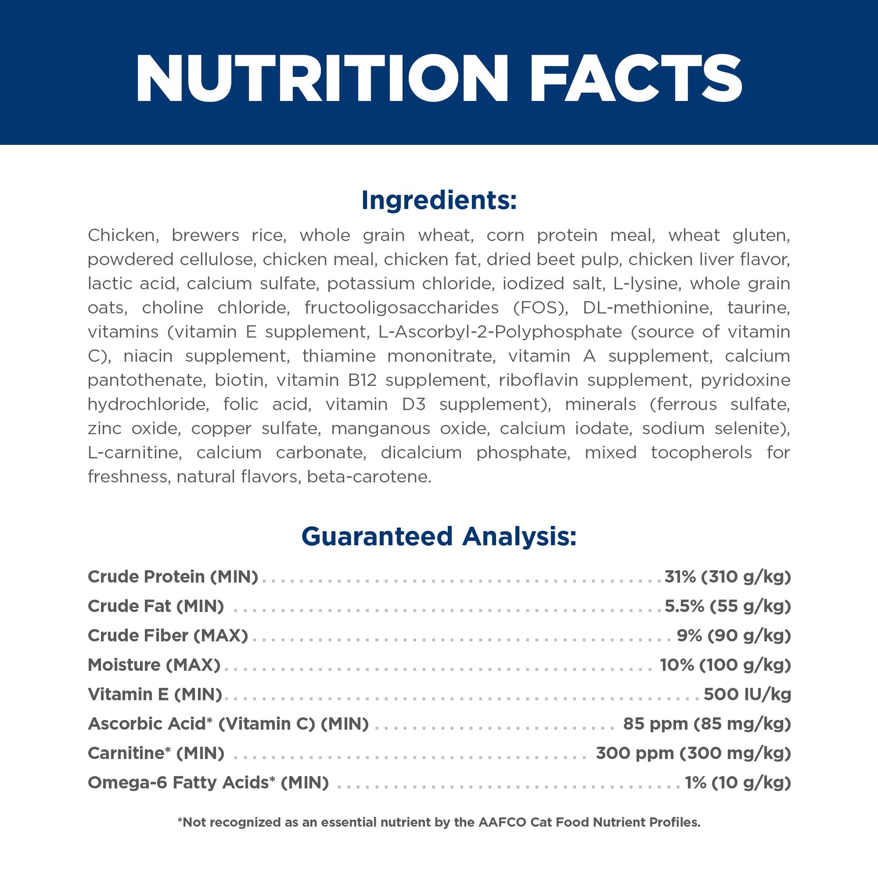 | ingredients | Chicken, Corn Gluten Meal, Whole Grain Wheat, Brewers Rice, Powdered Cellulose, Wheat Gluten, Chicken Fat, Chicken Liver Flavor, Calcium Sulfate, Lactic Acid, Dried Beet Pulp, Potassium Chloride, Dicalcium Phosphate, Choline Chloride, Iodized Salt, L-Lysine, Calcium Carbonate, vitamins (Vitamin E Supplement, L-Ascorbyl-2-Polyphosphate (source of Vitamin C), Niacin Supplement, Thiamine Mononitrate, Vitamin A Supplement, Calcium Pantothenate, Riboflavin Supplement, Biotin, Vitamin B12 Supplement, Pyridoxine Hydrochloride, Folic Acid, Vitamin D3 Supplement), Taurine, minerals (Ferrous Sulfate, Zinc Oxide, Copper Sulfate, Manganous Oxide, Calcium Iodate, Sodium Selenite), L-Carnitine, Mixed Tocopherols for freshness, Natural Flavors, Green Peas, Apples, Cranberries, Carrots, Broccoli, Beta-Carotene. |
