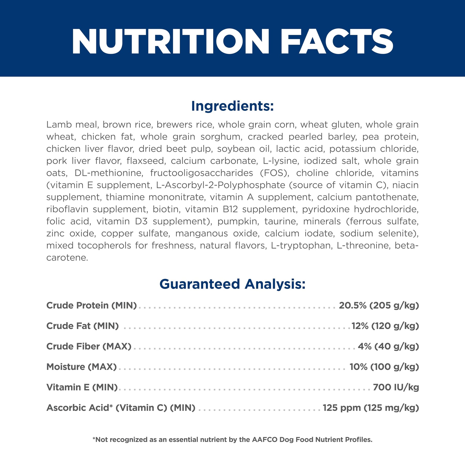 | ingredients | Lamb Meal, Brown Rice, Brewers Rice, Whole Grain Corn, Wheat Gluten, Whole Grain Wheat, Chicken Fat, Whole Grain Sorghum, Cracked Pearled Barley, Pea Protein, Chicken Liver Flavor, Dried Beet Pulp, Soybean Oil, Lactic Acid, Potassium Chloride, Pork Liver Flavor, Flaxseed, Calcium Carbonate, L-Lysine, Iodized Salt, DL-Methionine, Choline Chloride, vitamins (Vitamin E Supplement, L-Ascorbyl-2-Polyphosphate (source of Vitamin C), Niacin Supplement, Thiamine Mononitrate, Vitamin A Supplement, Calcium Pantothenate, Riboflavin Supplement, Biotin, Vitamin B12 Supplement, Pyridoxine Hydrochloride, Folic Acid, Vitamin D3 Supplement), Pumpkin, Taurine, minerals (Ferrous Sulfate, Zinc Oxide, Copper Sulfate, Manganous Oxide, Calcium Iodate, Sodium Selenite), Mixed Tocopherols for freshness, Natural Flavors, L-Tryptophan, L-Threonine, Beta-Carotene. |