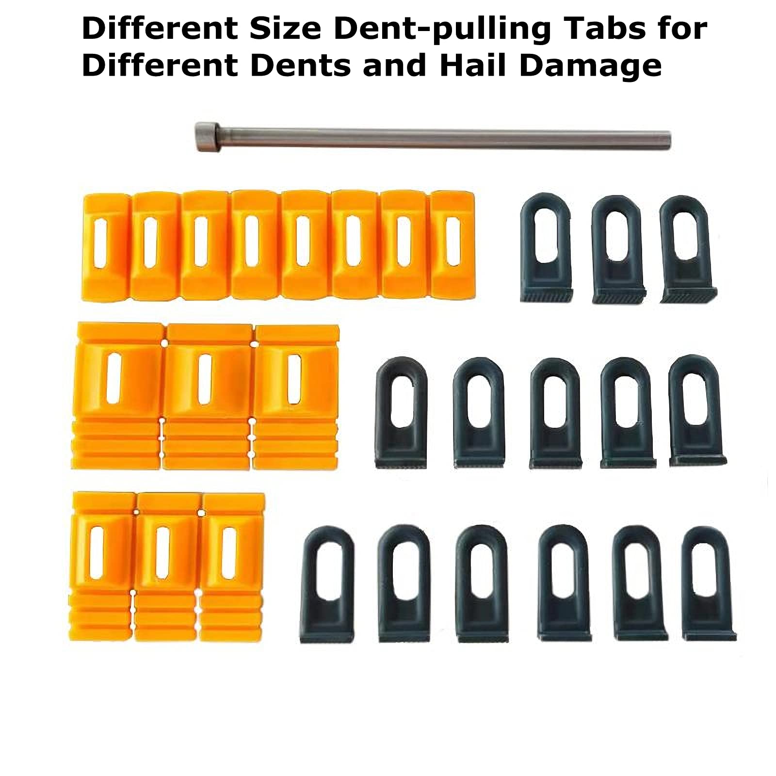 - Easy To OperatePackage includes 3 x different size yellow dent-pulling tabs, 14 x black slides and 1 x dent lifter. The different size dent-pulling tabs for different dents and hail damage that helps you to tackle any dent or dings repair. Paintless puller tabs is designed for any garage or professional body shop, it's easy to operate, control, dismantle and store.