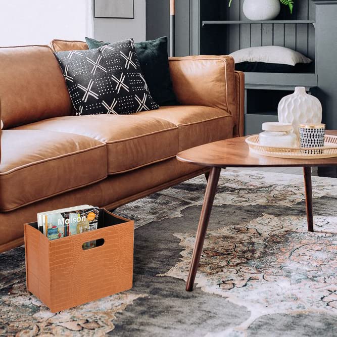 - Faux leather magazine holder organizer is perfect for storaging on the floor or tabletop, Place it by a Sofa with your favorite books or magazines, or by the entryway for mail and paperwork.
