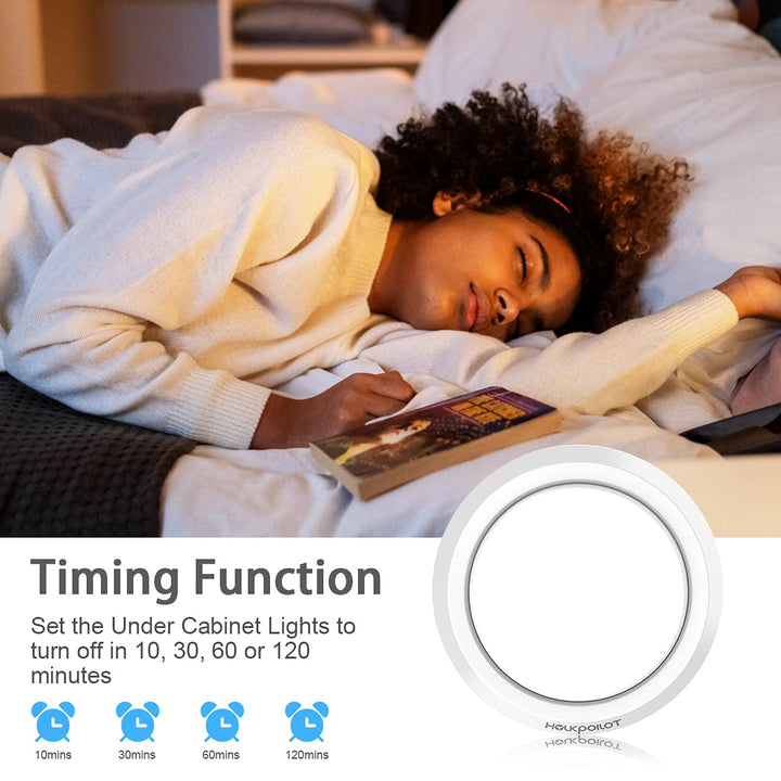 - TWO CONTROL MODES & ADJUSTABLE BRIGHTNESS TIMING DEVICEPuck lights are equipped with a remote control allowing you to control the lights remotely and set the color/brightness/timing. You can also press the lampshade to switch the light/adjust the color light, longer press can help you find the most suitable brightness. There are 4 kinds of brightness: 10%, 40%, 80%, 100%, and the timing function of 10min, 30min, 60min, 120min, allowing you to customize the lighting.
