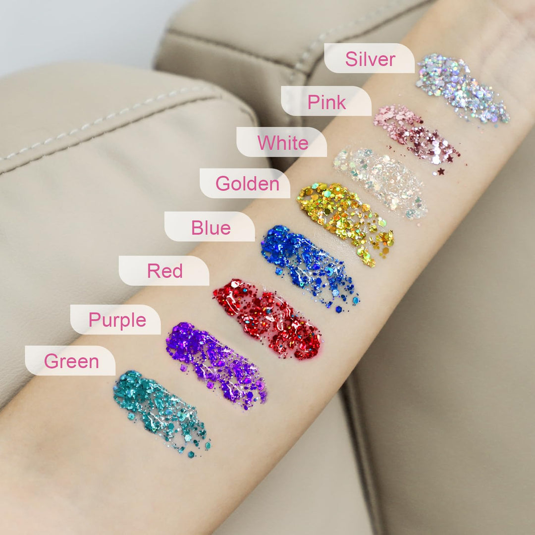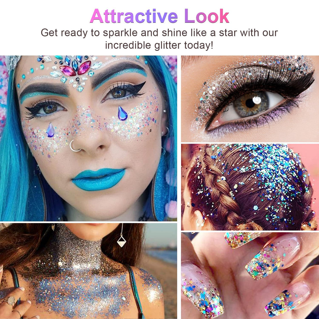 - Long Lasting Glitter - Body Glitter is made of high safety material, which is suitable for all skin. Sequins can be well attached to the skin without glue. 100% safe and non-irritating, you don’t worry about glue irritating your skin.