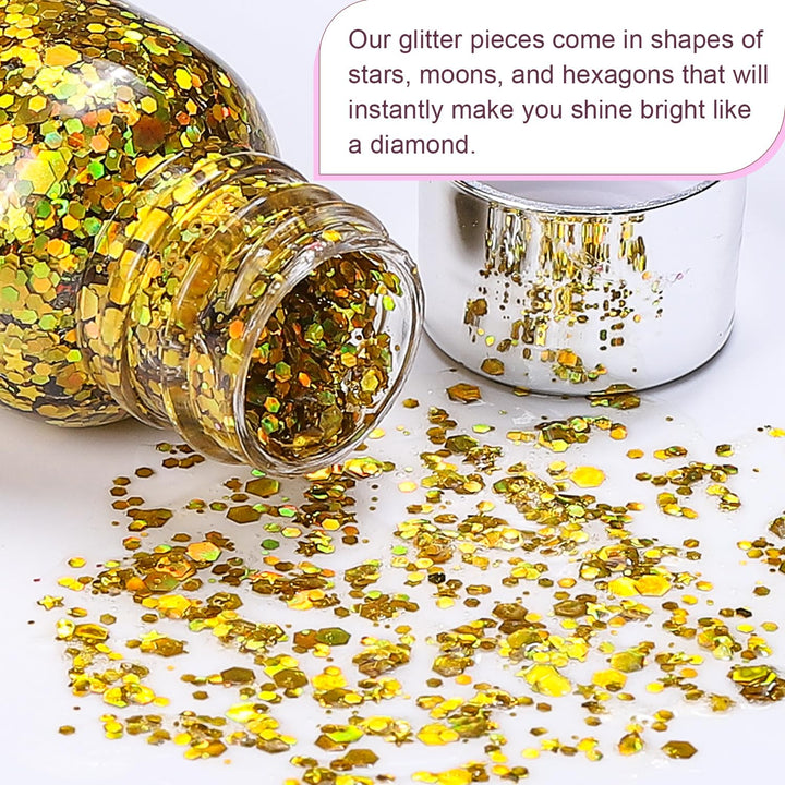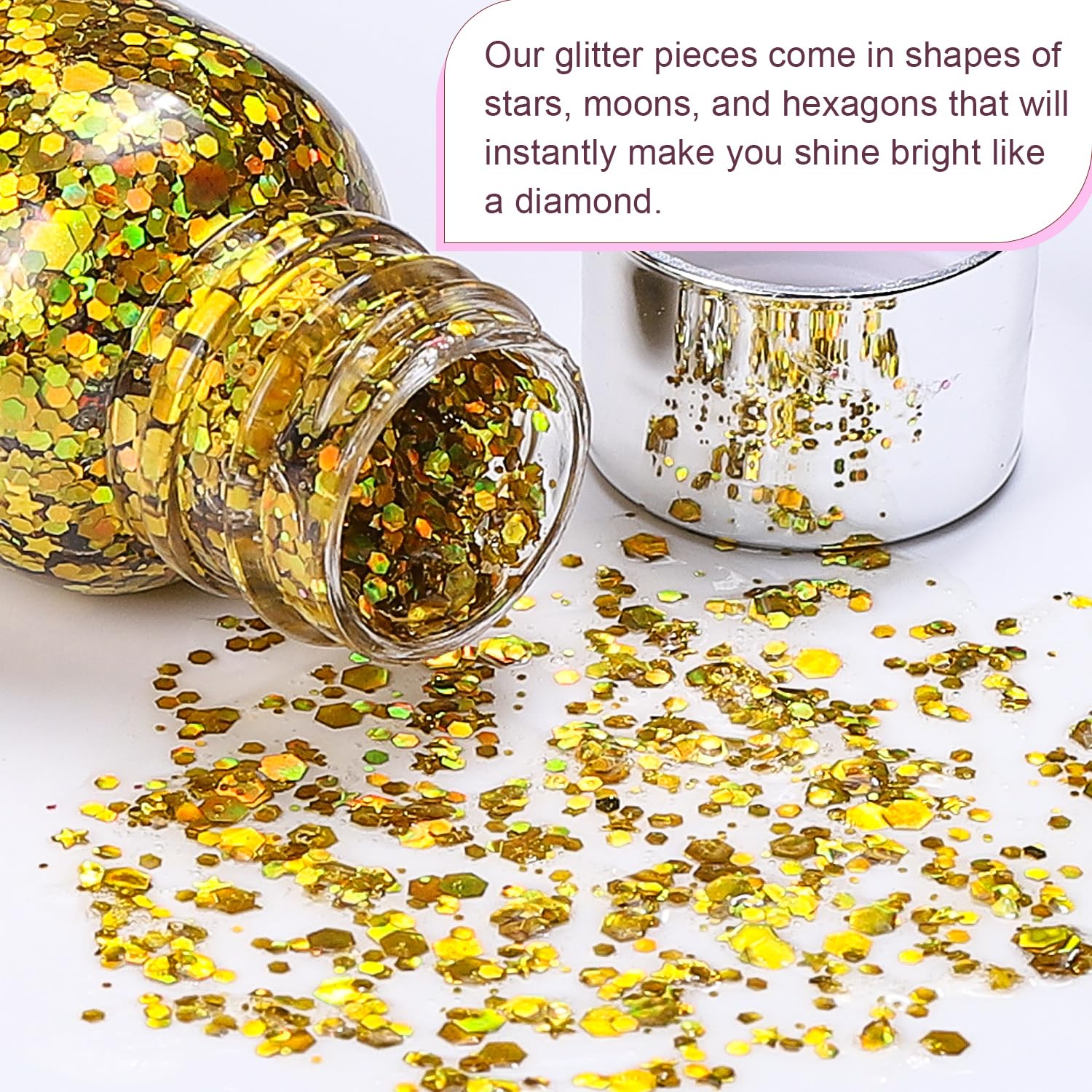 - Holographic Glitter - The color and luster of laser sequins vary with the perspective, like a rainbow. Besides, our body glitter use of high-quality bottle, it will not easy mess or spillage.
