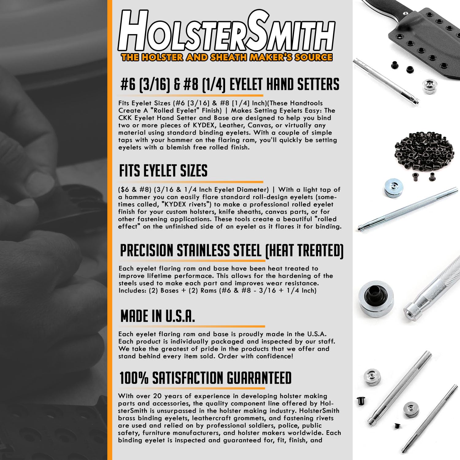 - 100% Satisfaction Guaranteed: With over 20 years of experience in developing holster making parts and accessories, the quality component line offered by HolsterSmith is unsurpassed in the holster making industry. HolsterSmith brass binding eyelets, leathercraft grommets, and fastening rivets are used and relied on by professional soldiers, police, public safety, furniture manufacturers, and holster makers worldwide. Each binding eyelet is inspected and guaranteed for, fit, finish, and quality.