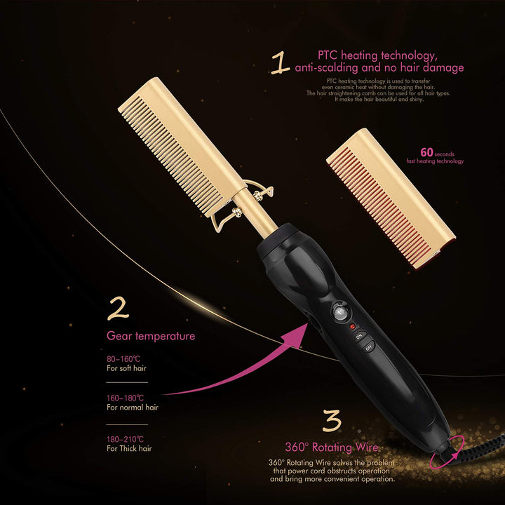 - Electric hot comb with 5 adjustable heat settings can reach up to 450°F, allowing to straighten hair/beard/wig in a lower or higher setting depending on the style you are trying to achieve.