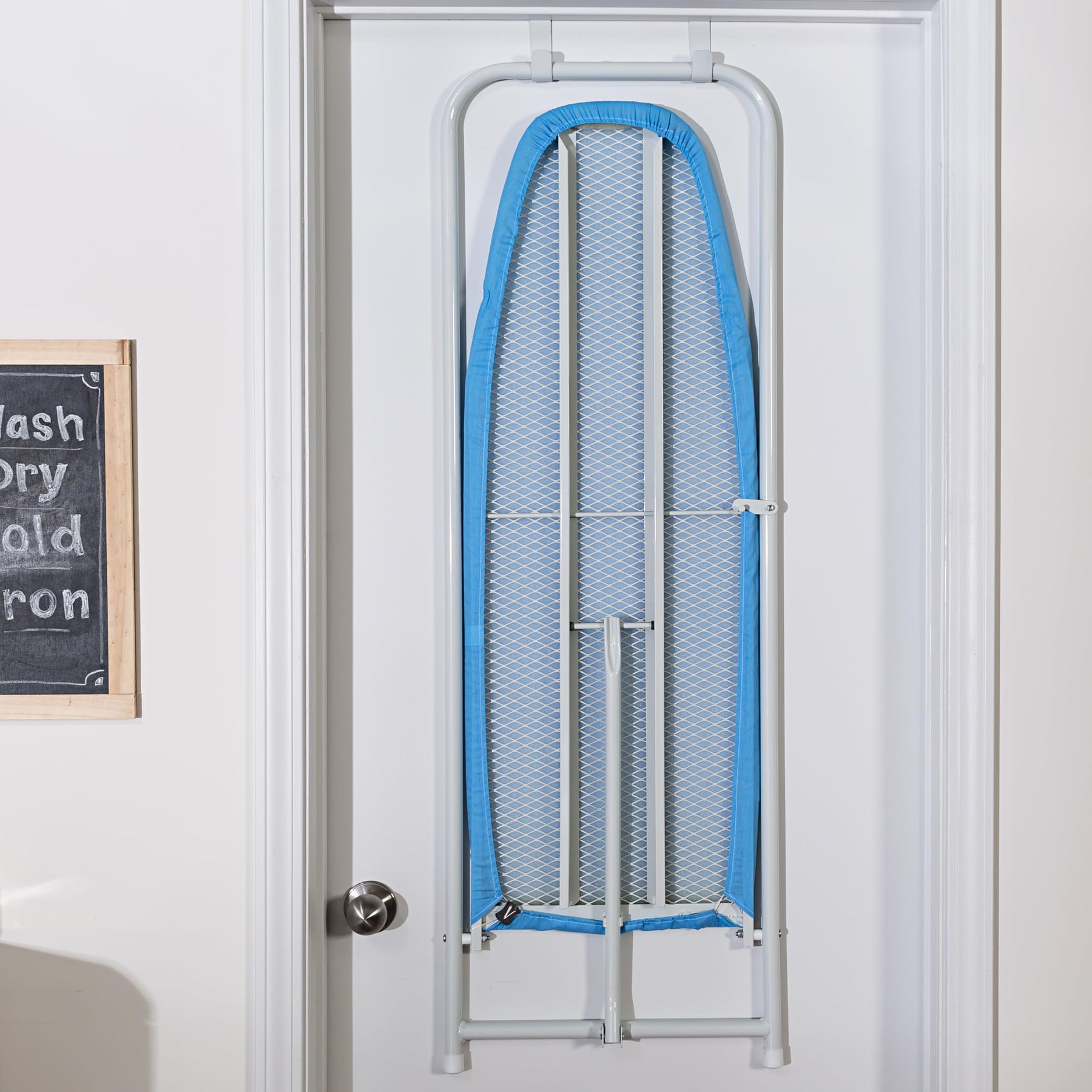 - Space-saving ironing board easily hangs over any standard door