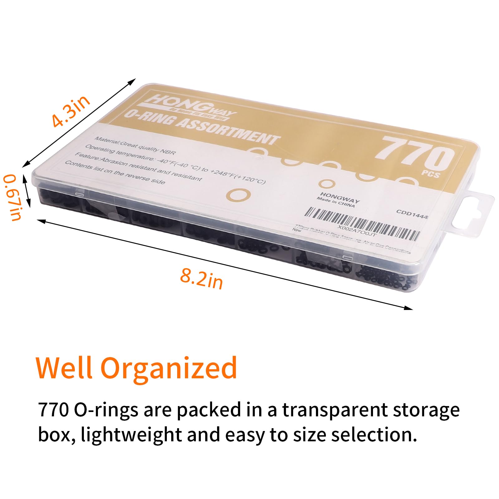 - PACKAGE INCLUDING This o ring assortment kit contains 770 o-rings in 18 sizes. A wide range of sizes and quantities will meet your needs.