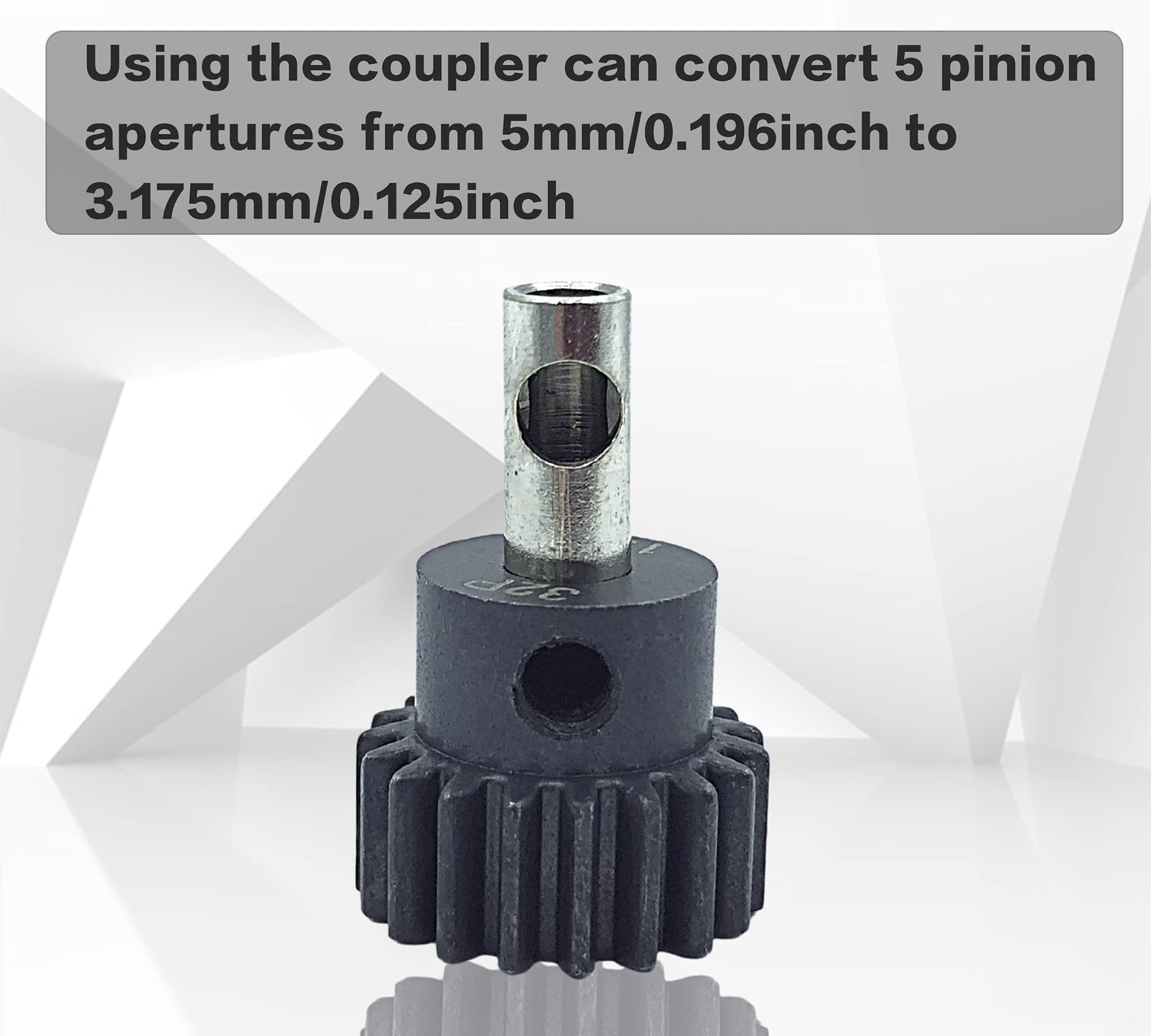 - Pinions SetInner diameter: 5.0mm/0.196inch, come with a 3.175mm coupler to convert 5 pinions apertures to 3.175mm/0.125inch. Suitble for 5mm and 3.175mm shaft motors