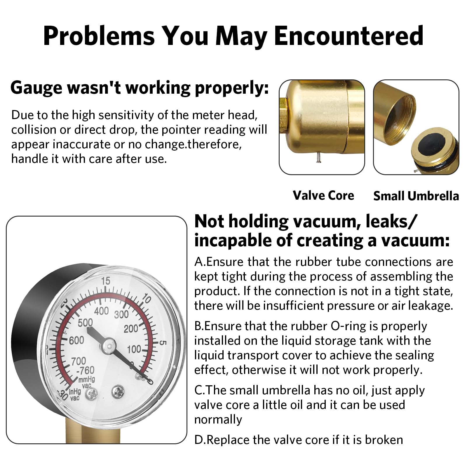 - Vacuum Gauge: Equipped with vacuum gauge, convenient readout of pressure, Pressure range: 0-30inches Hg, 0-760mm Hg.