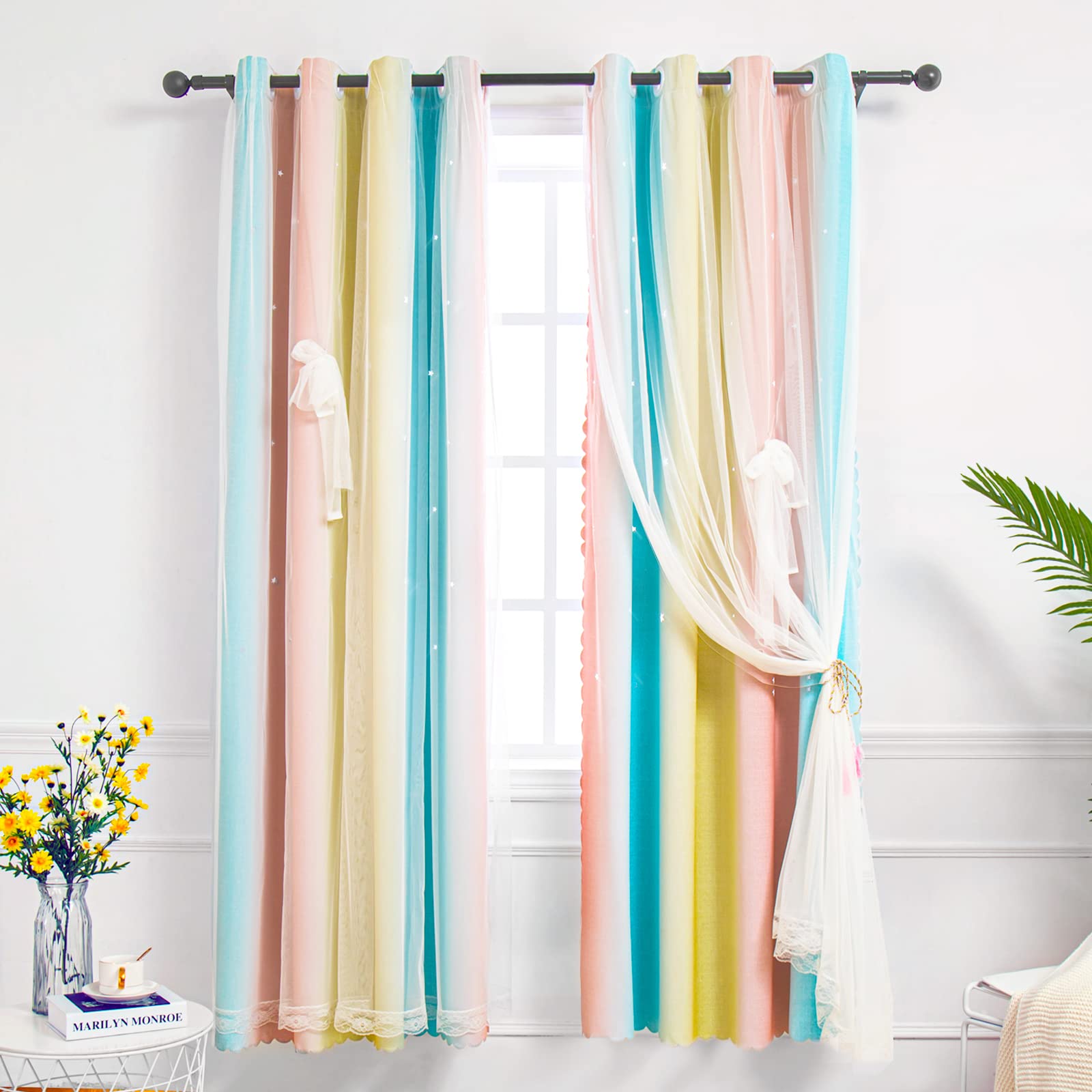 - Cutout Design: The classic cut out double layer star curtain and white lace yarn layer create a dreamy and romantic starry sky space for your girl's bedroom. Imagine the wonderful feeling of stars falling on your bed, on the floor, in the whole room. The gradient striped pink and blue color design is as beautiful as a rainbow after the rain, adding more different colors to your kid's room and adding a good mood and fun.
