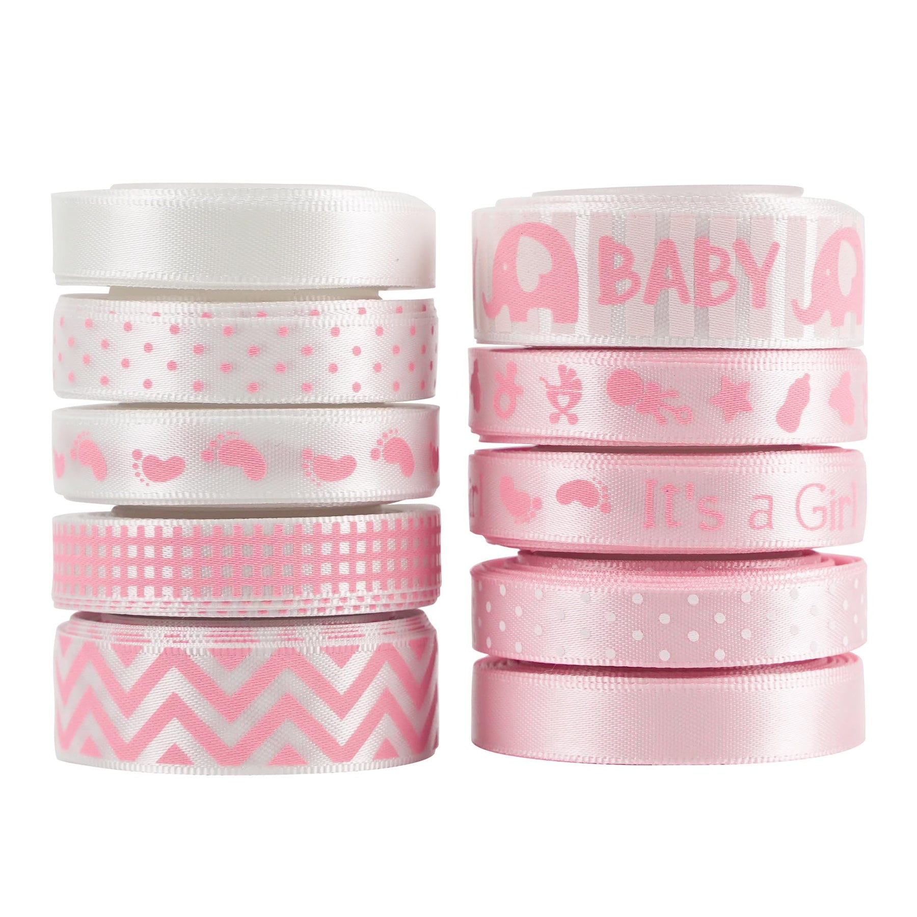 - RIBBON INCLUDES: 10 different styles pink baby shower ribbon, 5 yards each style in length, total 50 yards. One 3/8'' wide it's a girl design ribbons, one 3/8'' wide baby foot print ribbon, one 3/8'' wide check pattern print ribbon, one 3/8'' wide baby nipple design ribbon, 2 rolls of 3/8'' wide dot print ribbon, one 5/8 wide elephant ribbon tape, one 5/8 wide wave pattern ribbon