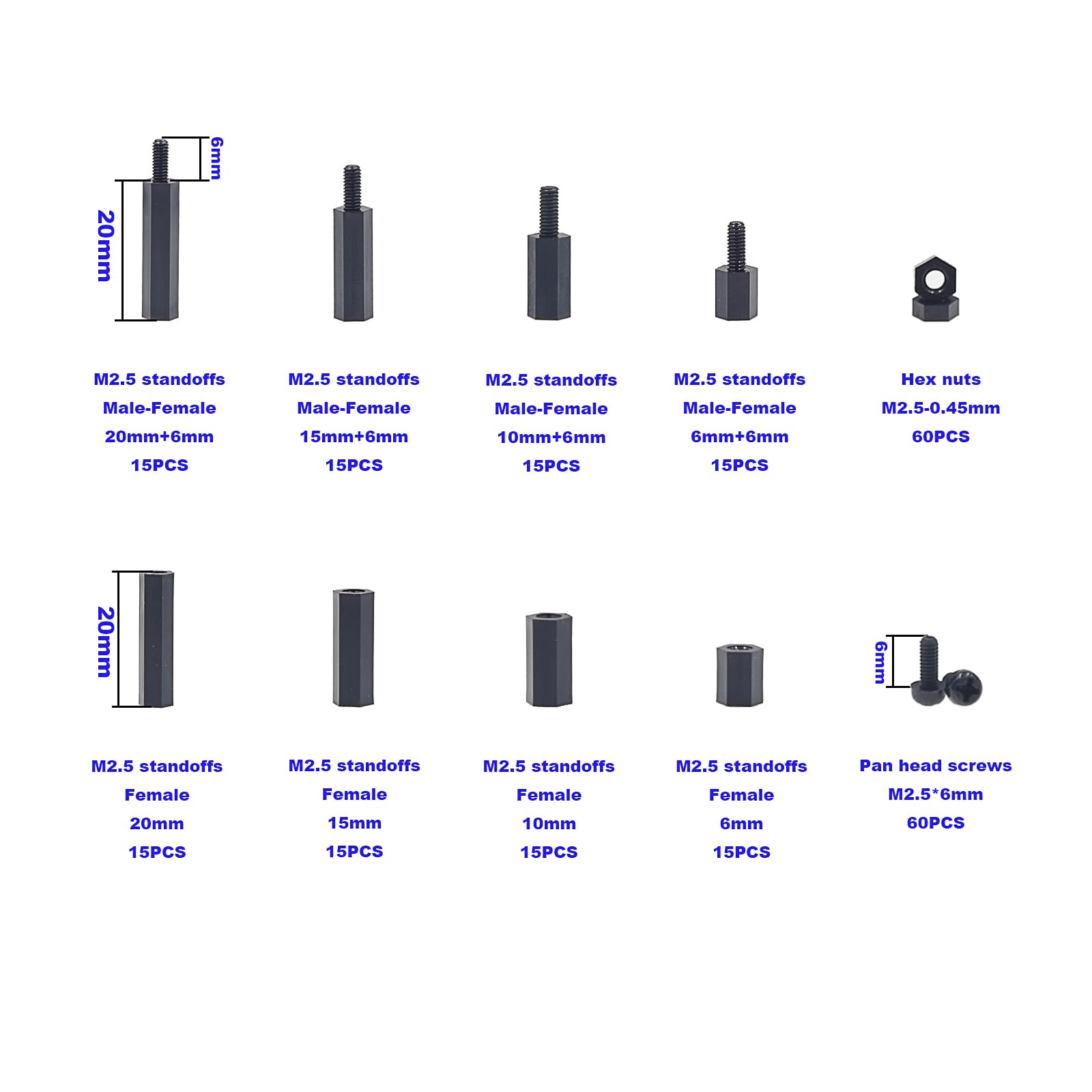 - Screw Thread: M2.5/(2.5mm), Thread Pitch: 0.45mm;The Male-Female Standoffs Different length:6mm+6mm(15pcs);6mm(15pcs);10mm+6mm(15pcs);10mm(15pcs);15mm+6mm(15pcs);15mm(15pcs);20mm+6mm(15pcs);20mm(15pcs).and Nylon Screws(60pcs)/Nuts(60pcs);