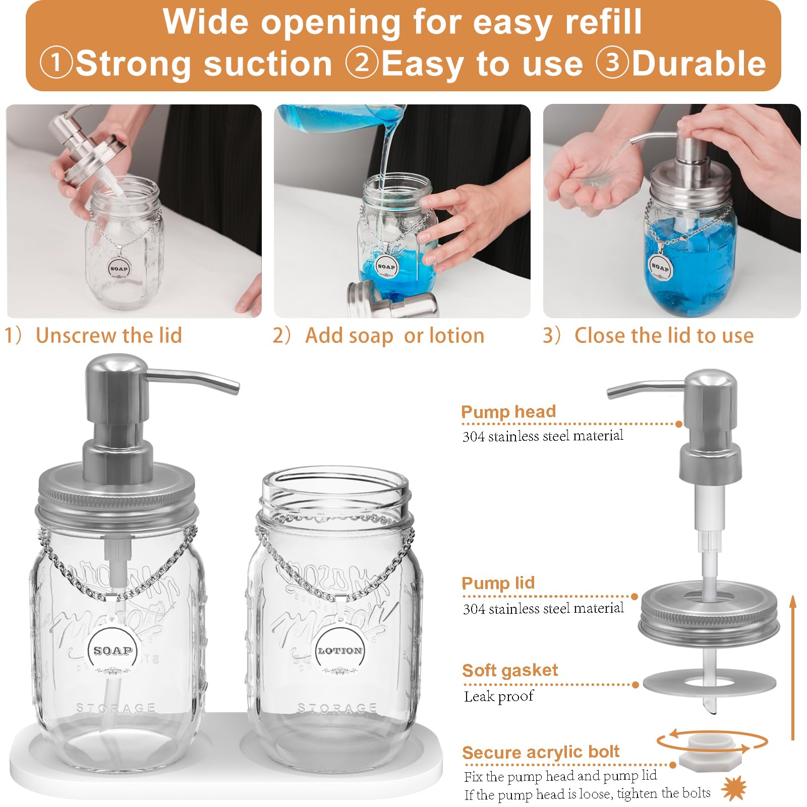 - DURABLE / RUSTPROOFThe thick, lead-free glass jar is not easy to break, clear and translucent. The pumps, lids, tags, and chain are all made of high-quality 304 stainless steel and will not rust after long-term use. The coaster is made of silicone material, non-slip, easy to clean