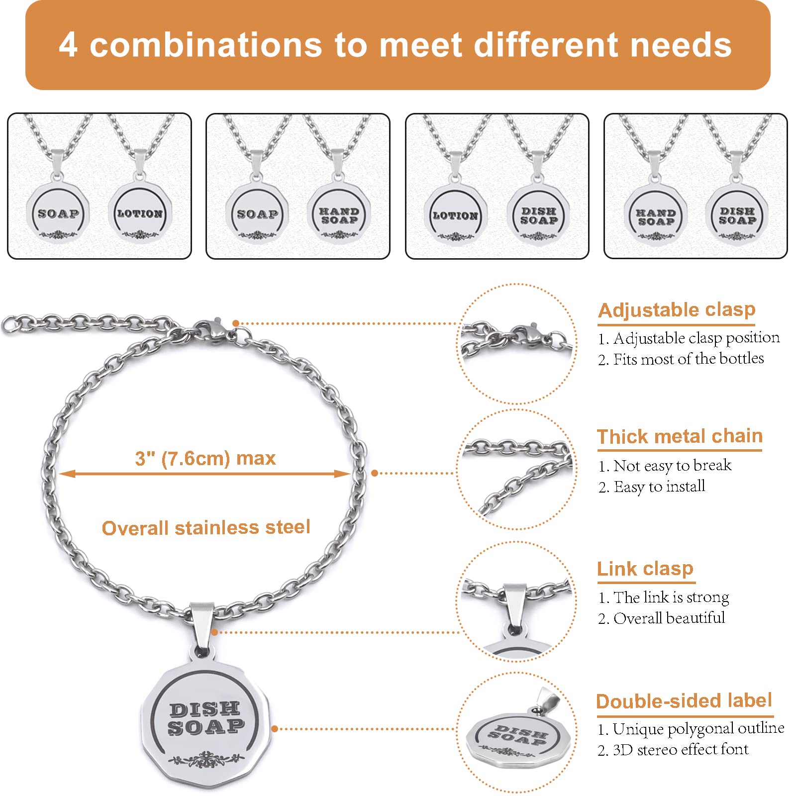 - Multiple CombinationsTwo double-sided labels can be used for kitchen or bathroom soap dispensers, lotion dispensers, hand soap dispenser, dish soap dispenser. 4 combinations to meet different needs: SOAP+LOTION SOAP+HAND SOAP LOTION+DISH SOAP DISH SOAP+HAND SOAP