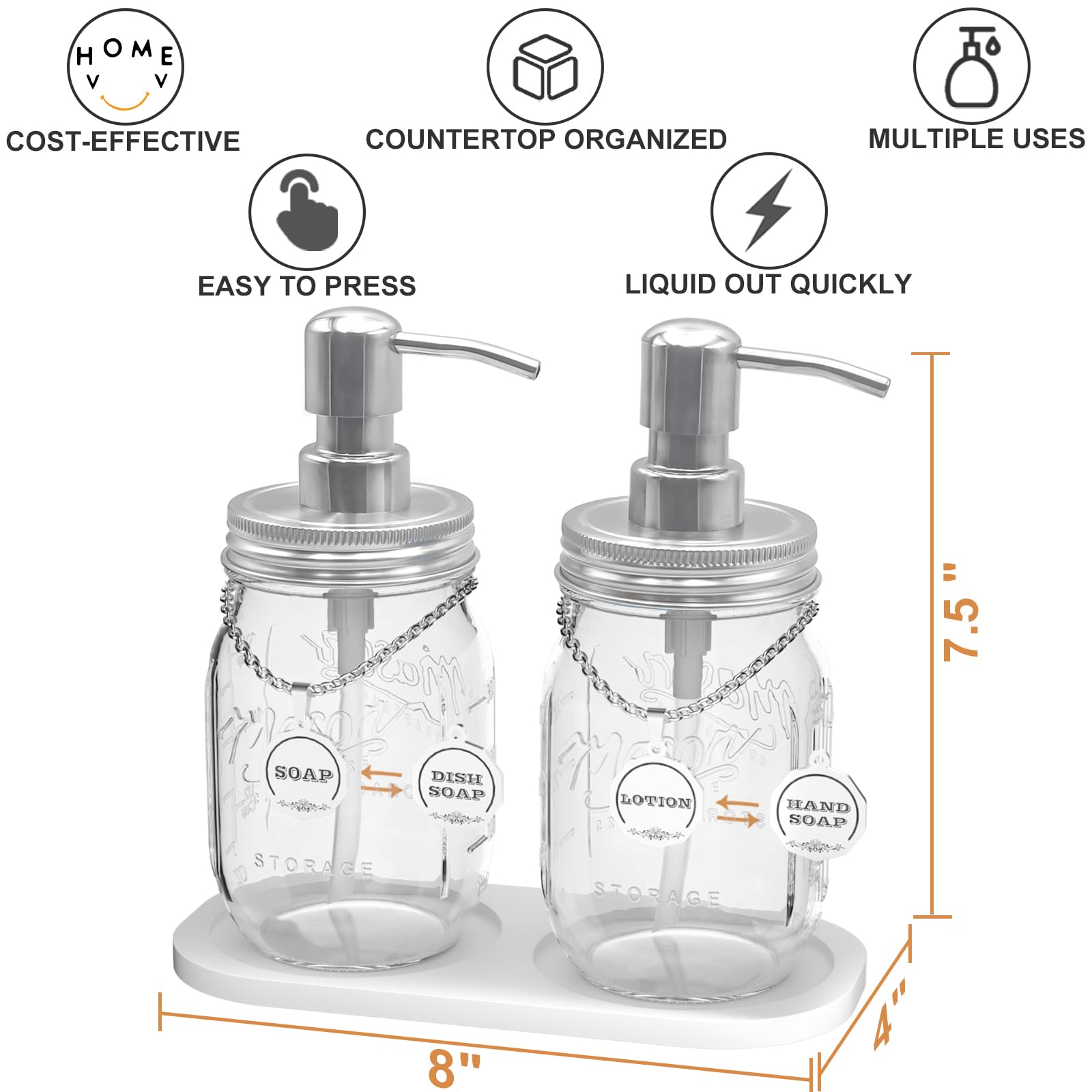 - Cost-EffectiveThe set contains 2 large-capacity 16-ounce glass Mason jars, 2 stainless steel liquid pumps and lids, 2 double-sided stainless steel labels with chains, and a 2-in-1 non-slip silicone coaster to keep your kitchen or bathroom countertops in perfect order