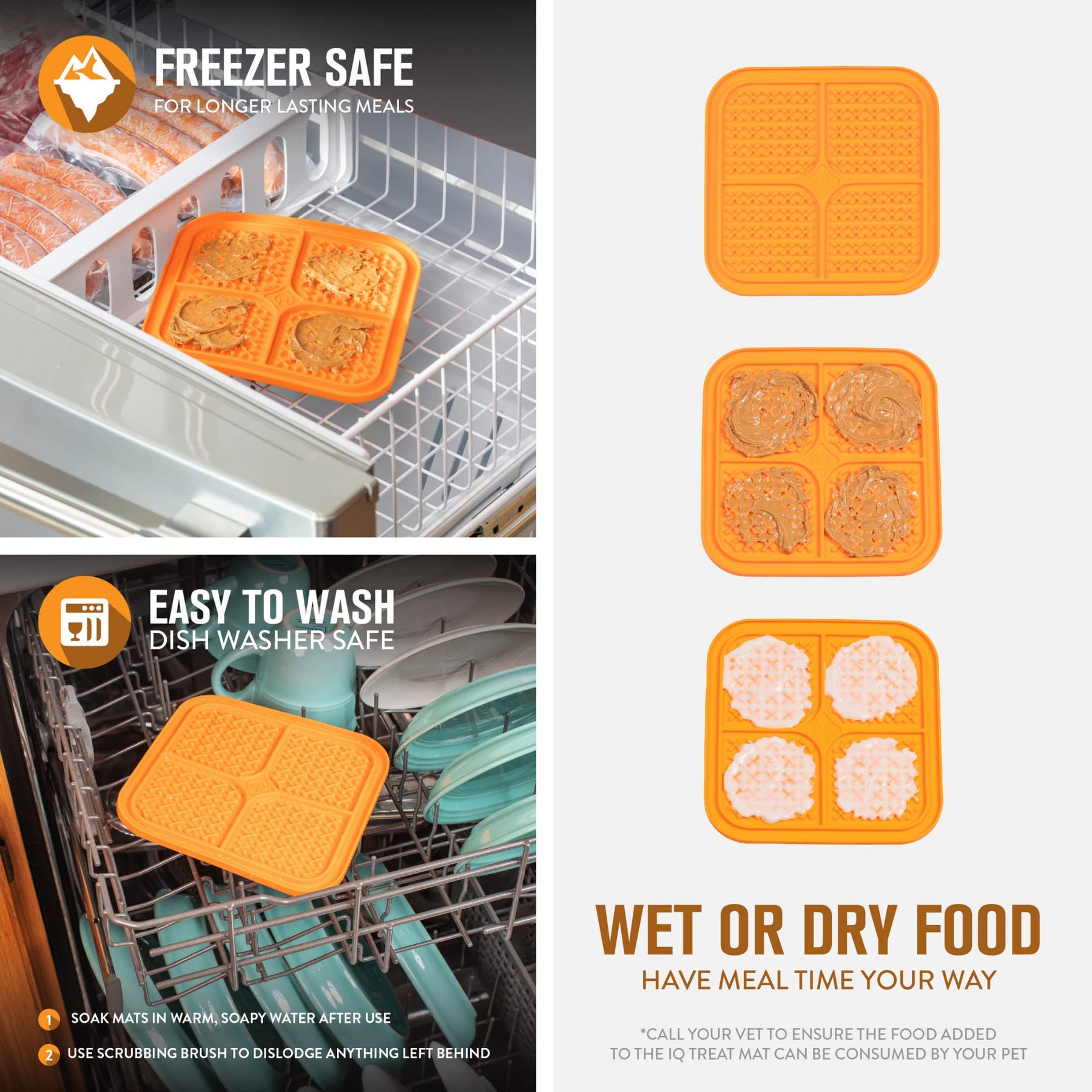 - THOUGHTFUL DESIGN: Our quadrant design helps guide portion control when spreading cat food, dog treats, dog snacks, or wet dog food on our dog lick pad. The raised patterns provide different texture options sure to keep your pet engaged. Not meant for aggressive chewers.
