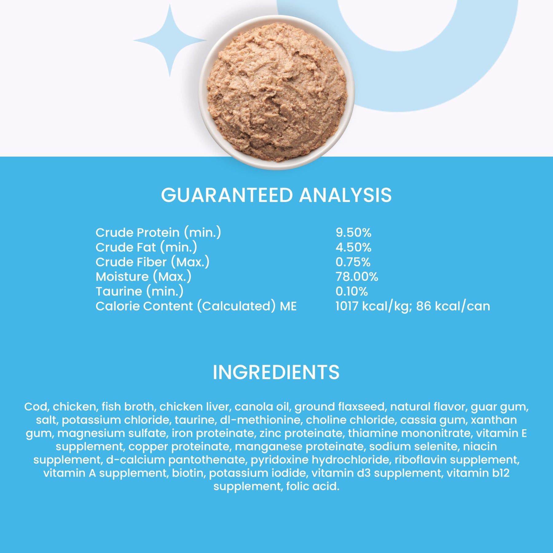 | ingredients | Cod, chicken, fish broth, chicken liver, canola oil, ground flaxseed, natural flavor, guar gum, salt, potassium chloride, taurine, dl-methionine, choline chloride, cassia gum, xanthan gum, magnesium sulfate, iron proteinate, zinc proteinate, thiamine mononitrate, vitamin E supplement, copper proteinate, manganese proteinate, sodium selenite, niacin supplement, d-calcium pantothenate, pyridoxine hydrochloride, riboflavin supplement, vitamin A supplement, biotin, potassium iodide, vitamin d3 supplement, vitamin b12 supplement, folic acid. |