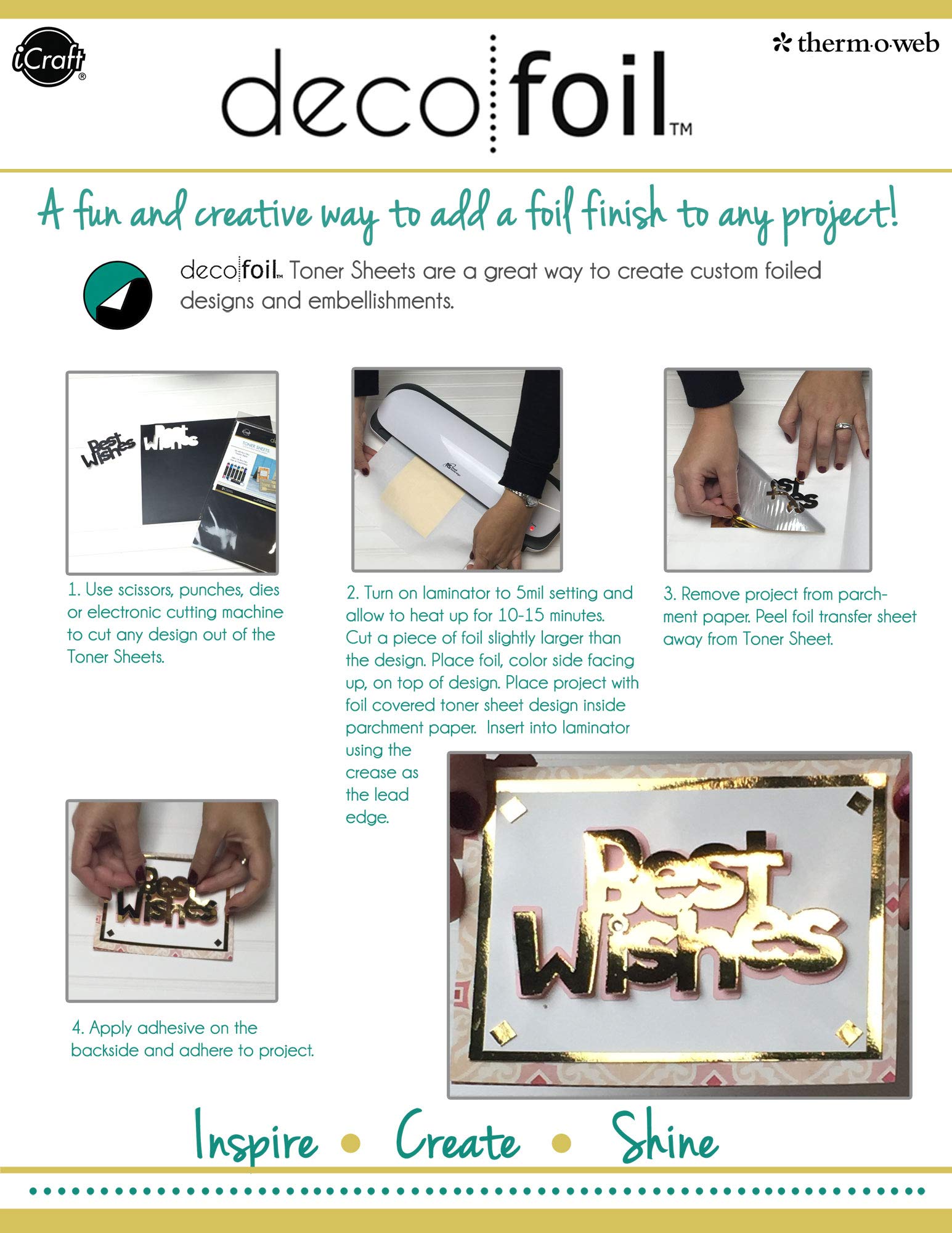 - Simply use scissors, punches, dies or an electronic cutting machine to cut any shape; Layer with Deco Foil Transfer Sheets (sold separately) and run through a hot laminator; Apply adhesive, such as a Zot or mounting square (not included), and place on your project