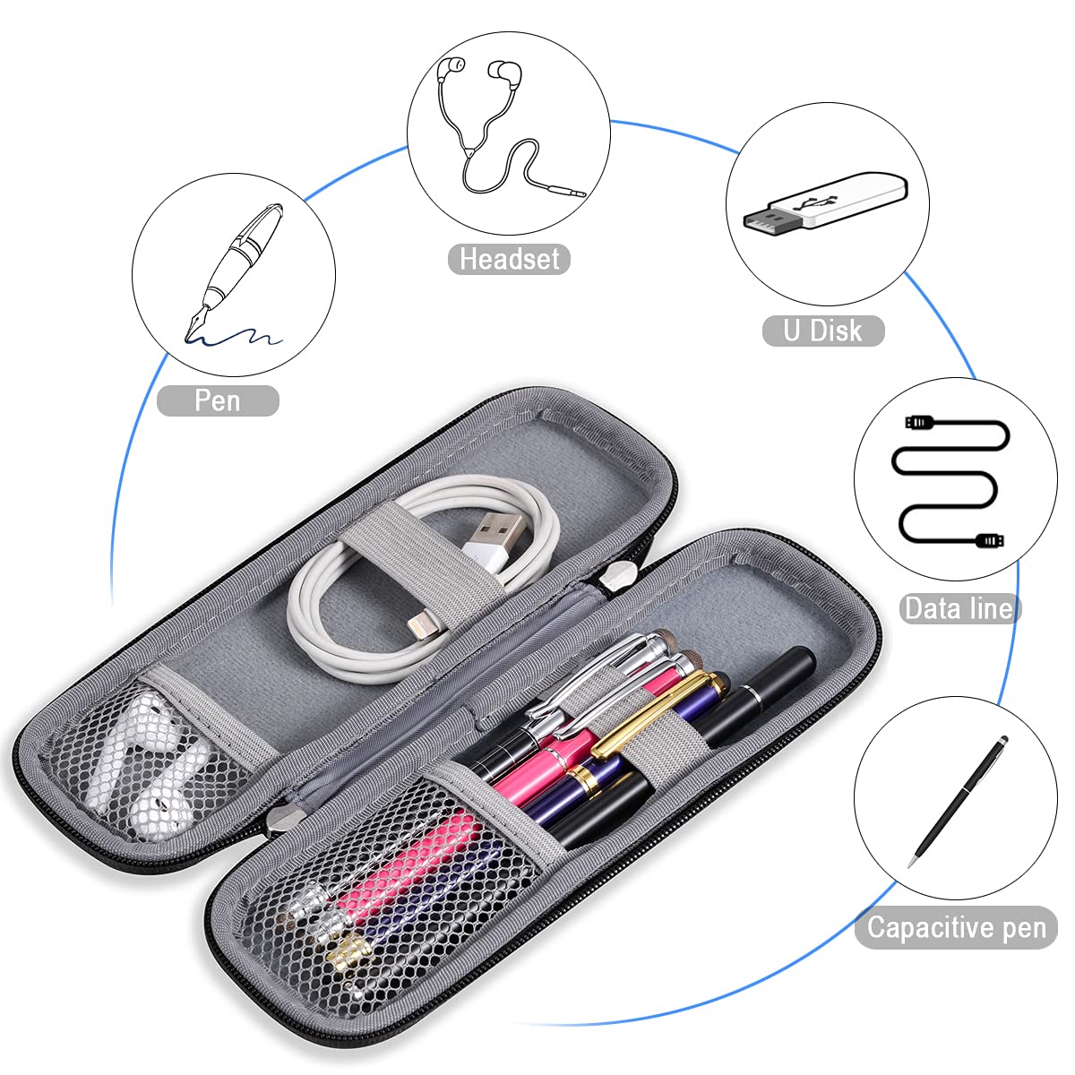 - Interior pocket,storage space for Apple pencils,stylus pen,fountain pens,marker pens,earbuds,headphones,charging cables,and other accessories
