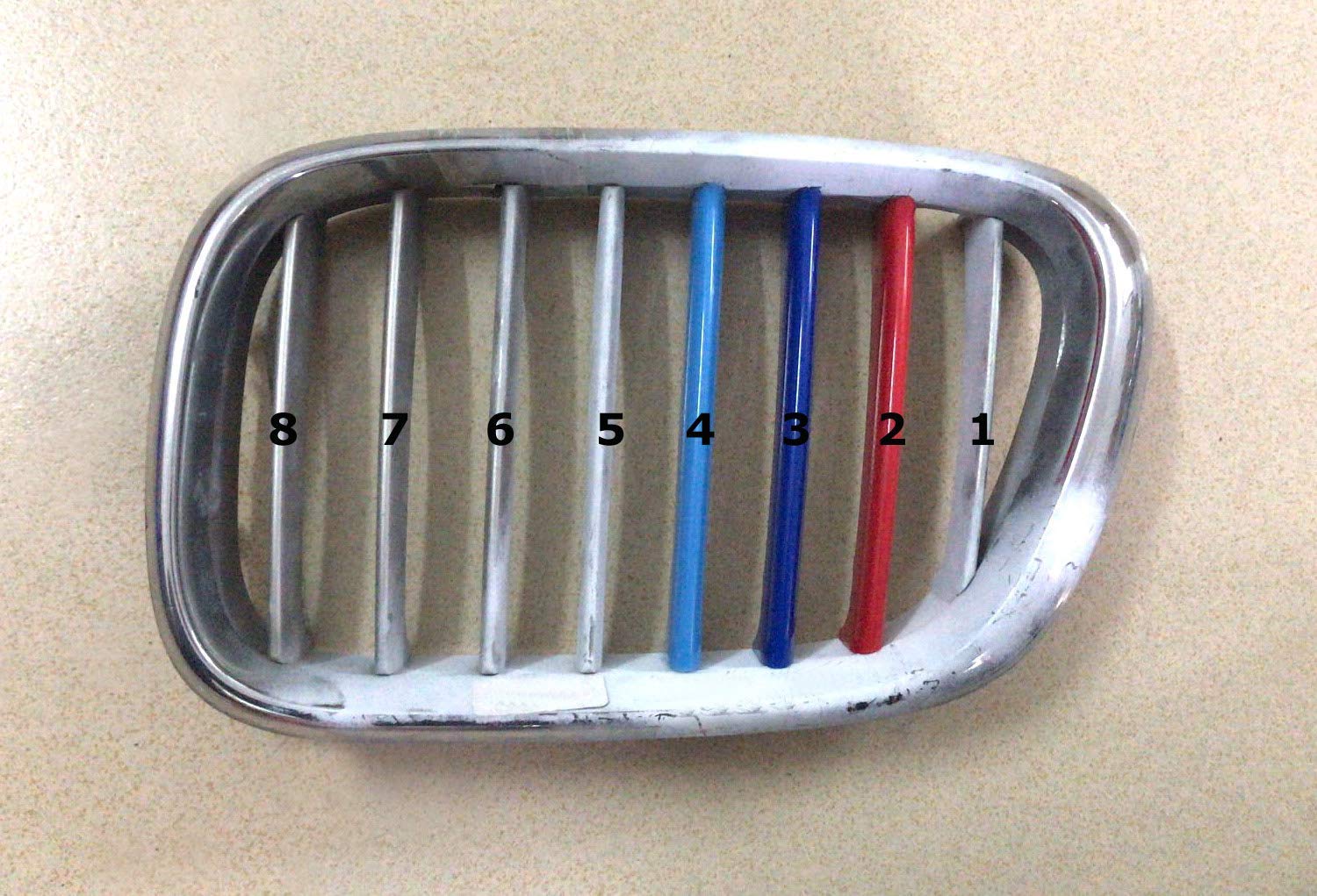 - Installation tip: Fit right side of the roundel badge mesh, start from the right fit beam order of 2 (red), 3 (dark blue), and 4 (light blue), ensuring the overlay cover's clips securely hook onto the OEM chrome or black kidney grilles