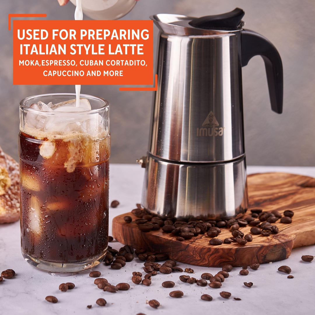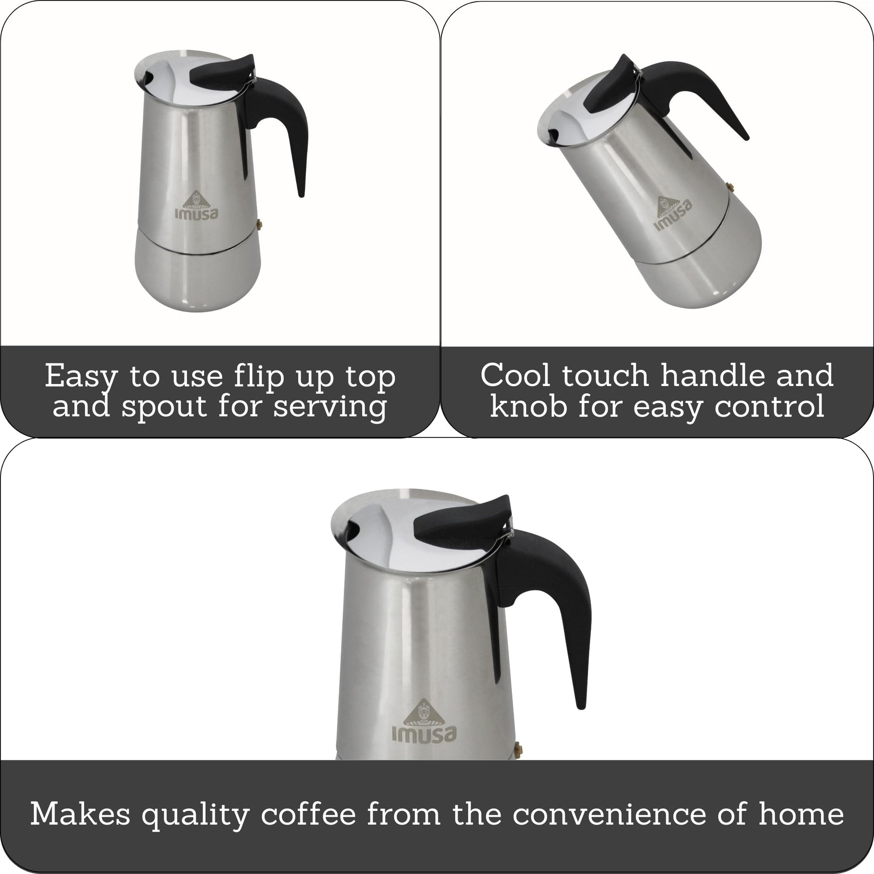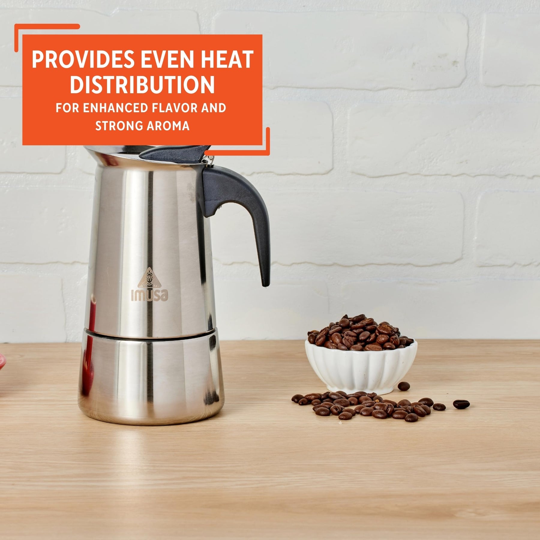 - Original Stovetop Espresso & Moka Pots – IMUSA USA B120-22061M Stainless Steel Stovetop Espresso Coffeemaker 4-Cup, Silver by Imusa