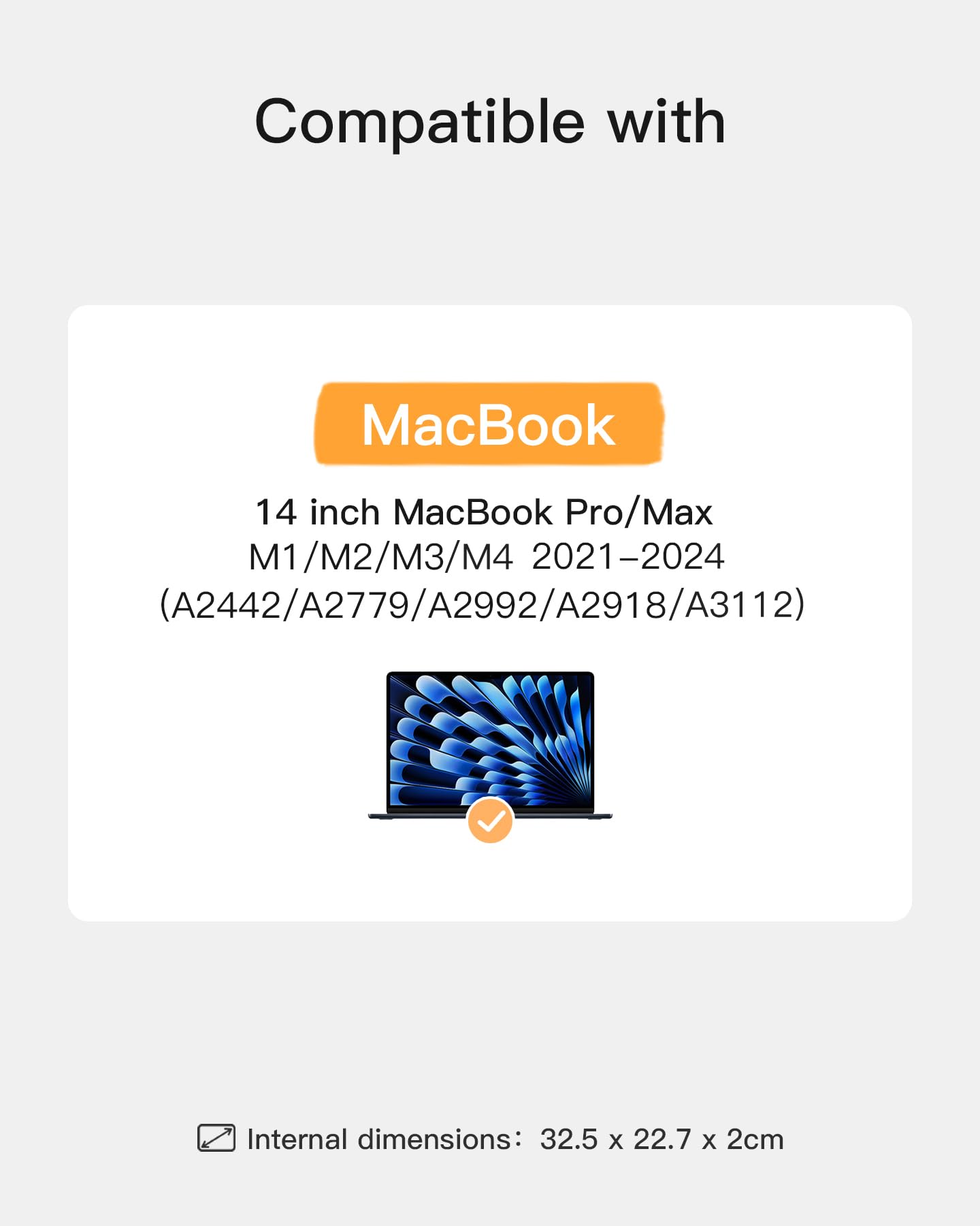 - Compatibility: This laptop bag case compatible with 14-inch New MacBook Pro M3/M2/M1 Pro/Max A2992 A2918 A2779 A2442 2024-2021; Also fits 13-inch iPad Pro (M4)/iPad Air (M2)/12.9-inch iPad Pro (6th/5th/4th/3rd Gen.)with Magic Keyboard/Smart Keyboard Folio, 13.8-inch New Surface Laptop 7th Edition, Copilot+ PC 2024. Internal dimension 32.5 × 22.7 × 2 cm (12.79 × 9 × 0.78 in)
