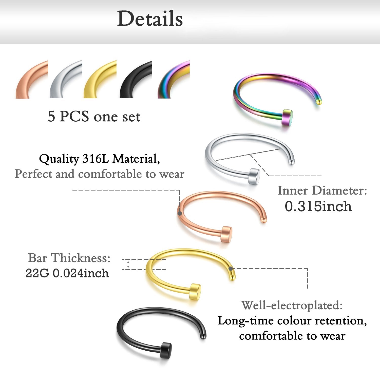 - [PERFECT FIT] -- Our nose rings come in different sizes to suit all people. Gauge size: 22G (0.6mm), stud piercing, bar length: 7mm, CZ size: 2mm, nose rings hoops inner diameter: 8mm. Easy to insert and remove.