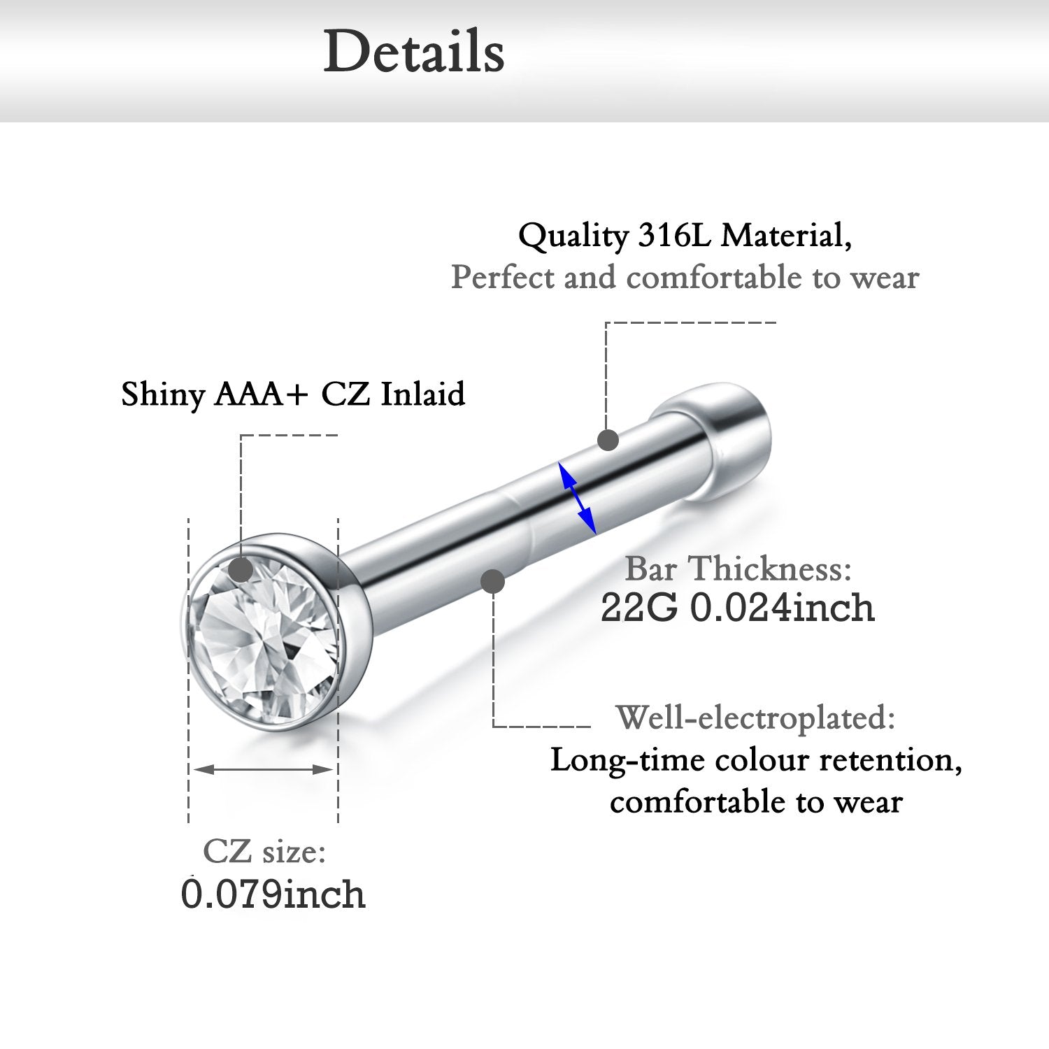 - [PREMIUM MATERIALS] -- Made of high-quality 316L stainless steel, our nose rings are rust-resistant, safe, and comfortable to wear. They are also nickel and lead-free, hypoallergenic, and safe for sensitive skin. The AAA+ CZ stones are shiny and eye-catching.